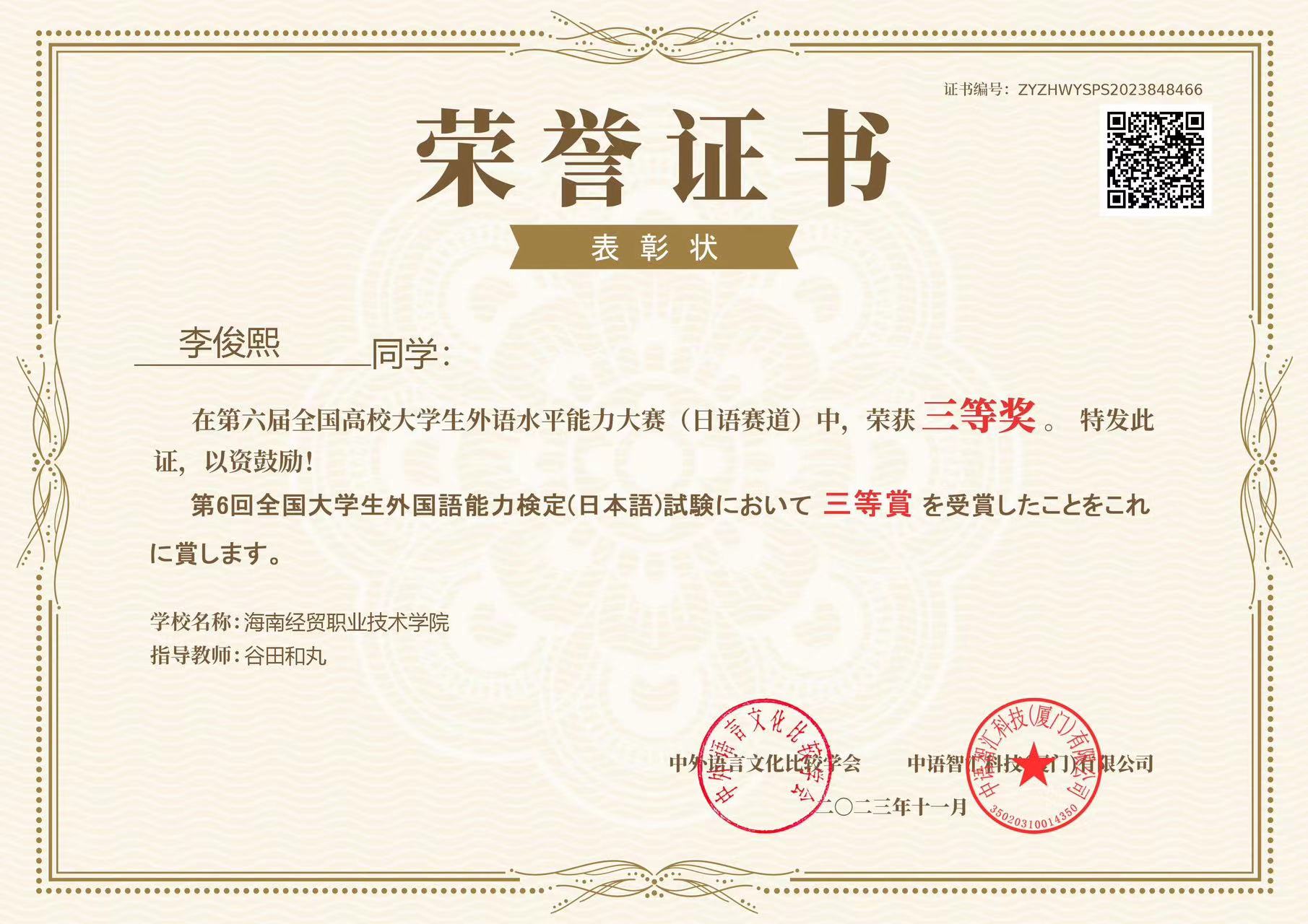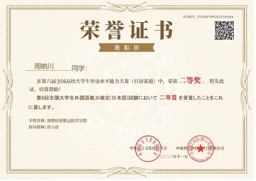 喜报:在2023年第六届全国高校老员工外语水平能力大赛中,国际教育公司应用日语专业员工周纳川,参加日语赛道比赛,获二等奖1项,指导老师陈小苗,孙婉轩、李俊熙、郭伟峰,分获三等奖3项,指导老师林由惠、谷田和丸、陈小苗。恭喜以上四位同学,以及辛苦培训的日语教师们。
