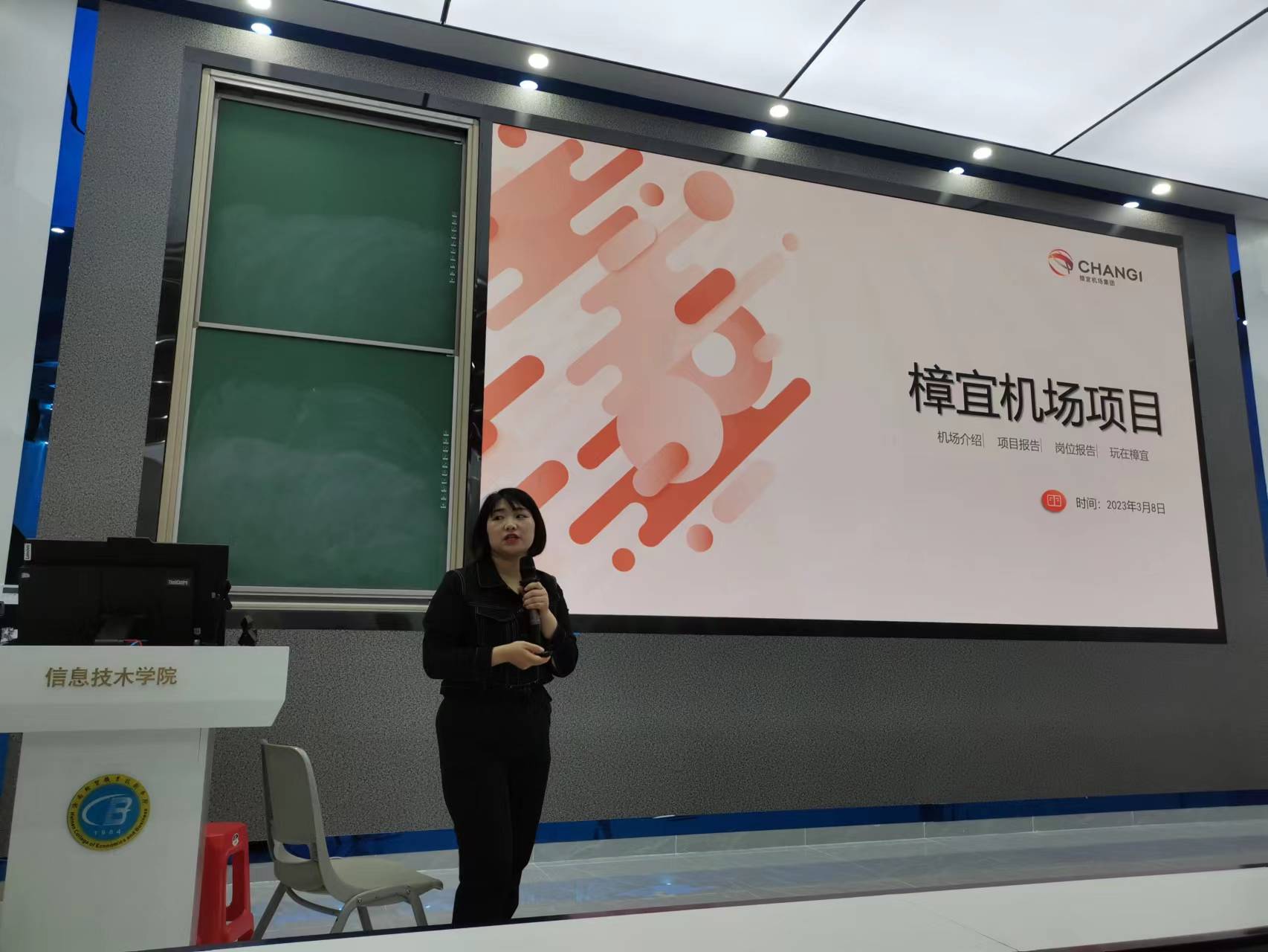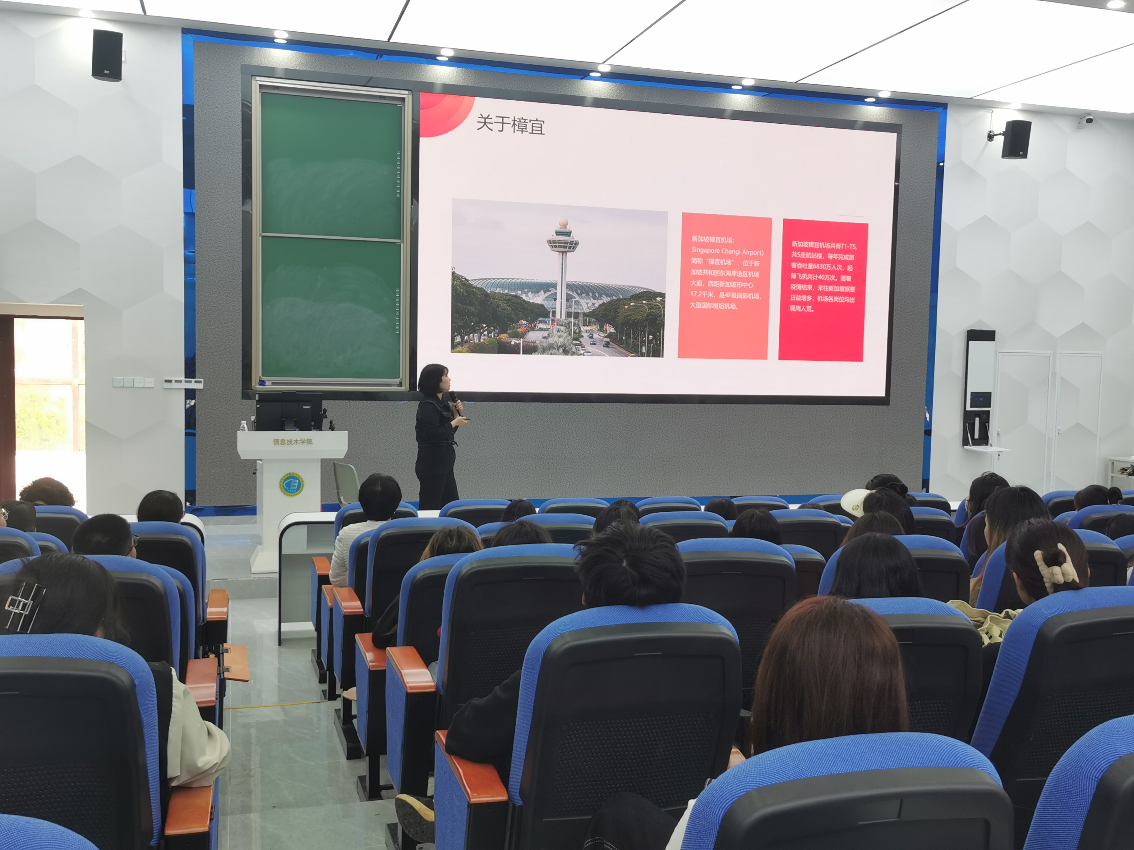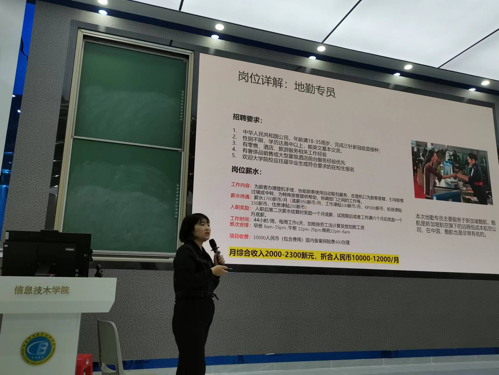 本次企业宣讲人是来自中澜公司的校企项目部经理高茜玲。高经理重点介绍了新加坡樟宜机场地勤客服人员、樟宜机场免税店销售人员、樟宜机场体验大使三个岗位的招聘要求和岗位职责与薪水等。