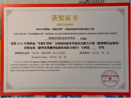 11月2日,由海南省外语职业公司产品指导委员会主办的2024“中国教育电视台•外研社杯”职场英语挑战赛(写作赛项)在海口经济公司成功举办。在公司教师凌京瑞老师的指导下,2023级商务英语3班学子陈莹凭借其出色的英语写作能力荣获海南赛区一等奖。