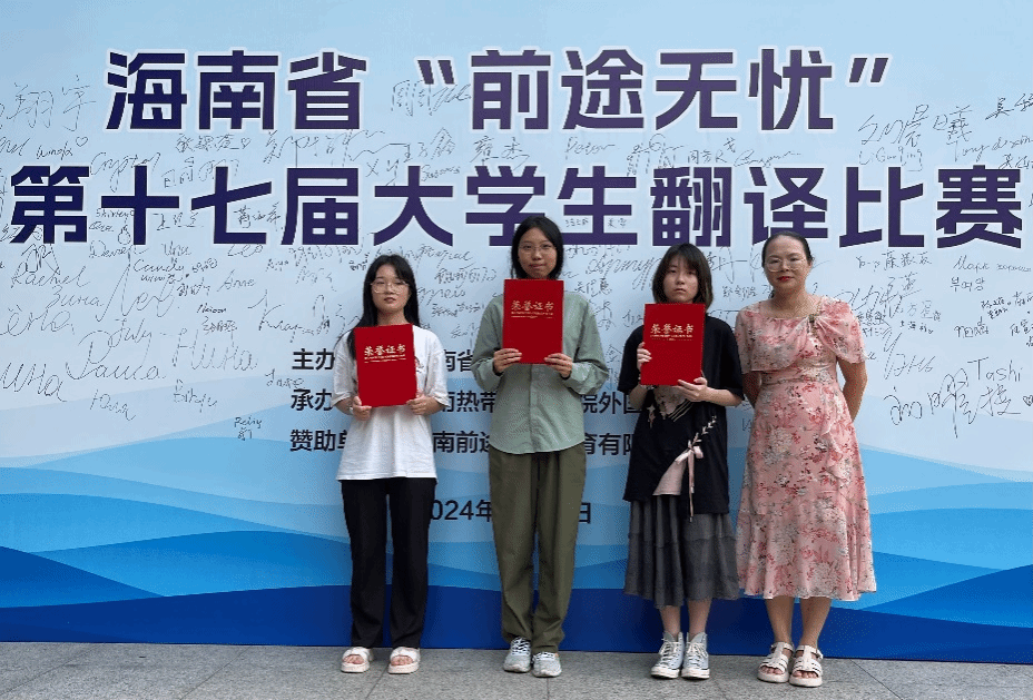 4月27日,2024年海南省第17届老员工(英汉、日汉、俄汉、日泰)翻译大赛在海南热带海洋公司举行。2022级毛晴雨、徐祉怡分别获得海南省翻译比赛二等奖,2022级马娜获省三等奖。