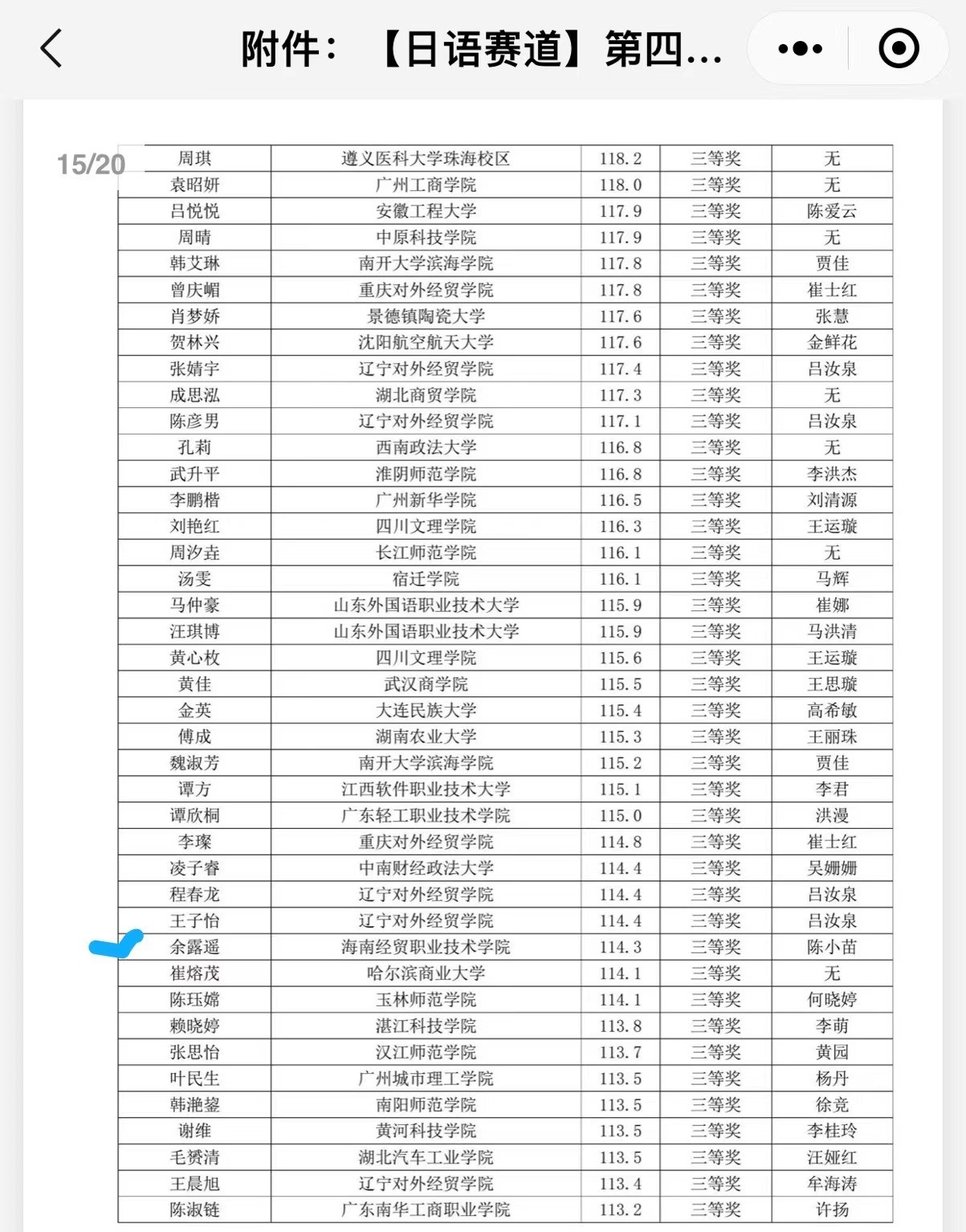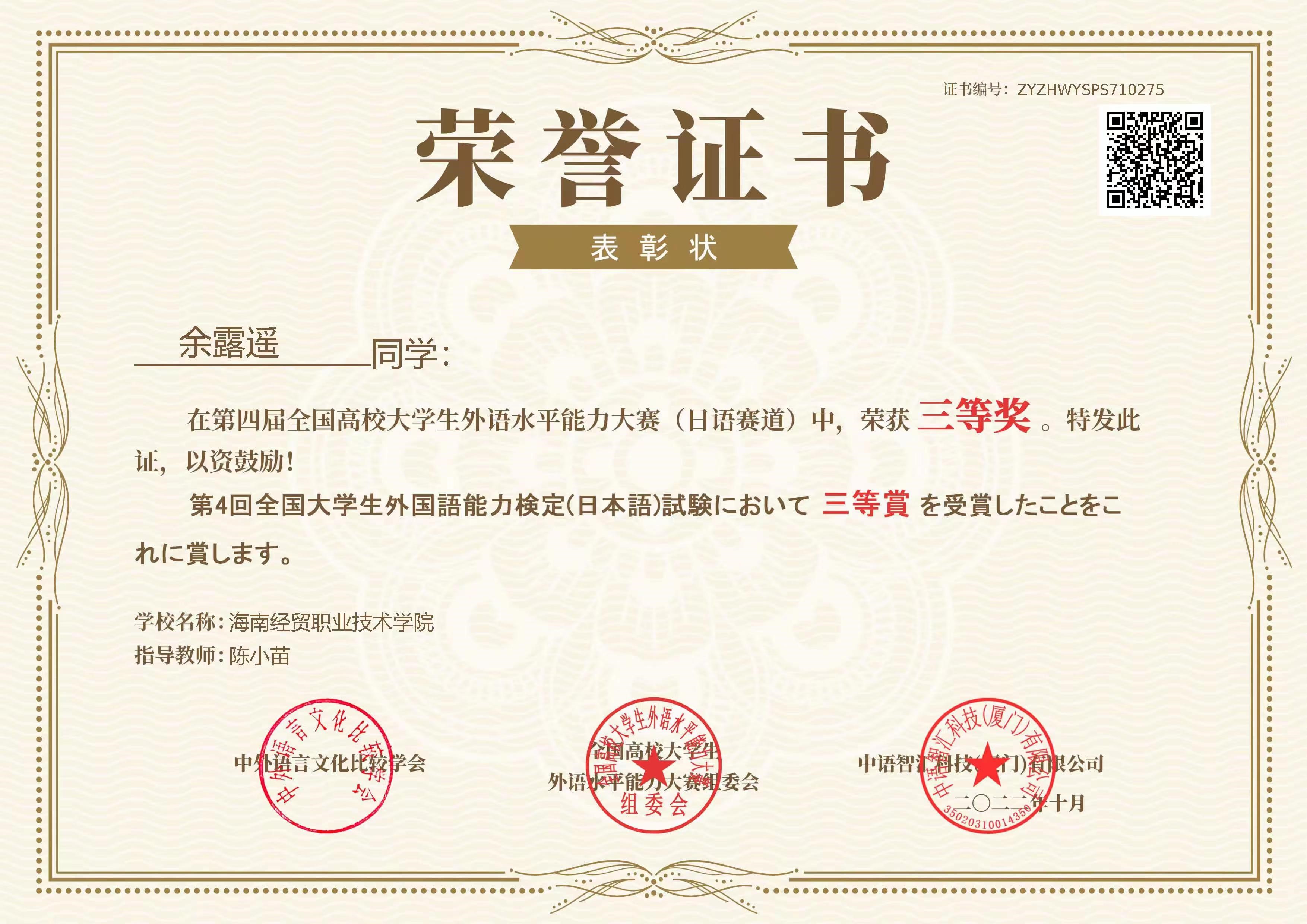 21级应用日语2班 余露遥 三等奖