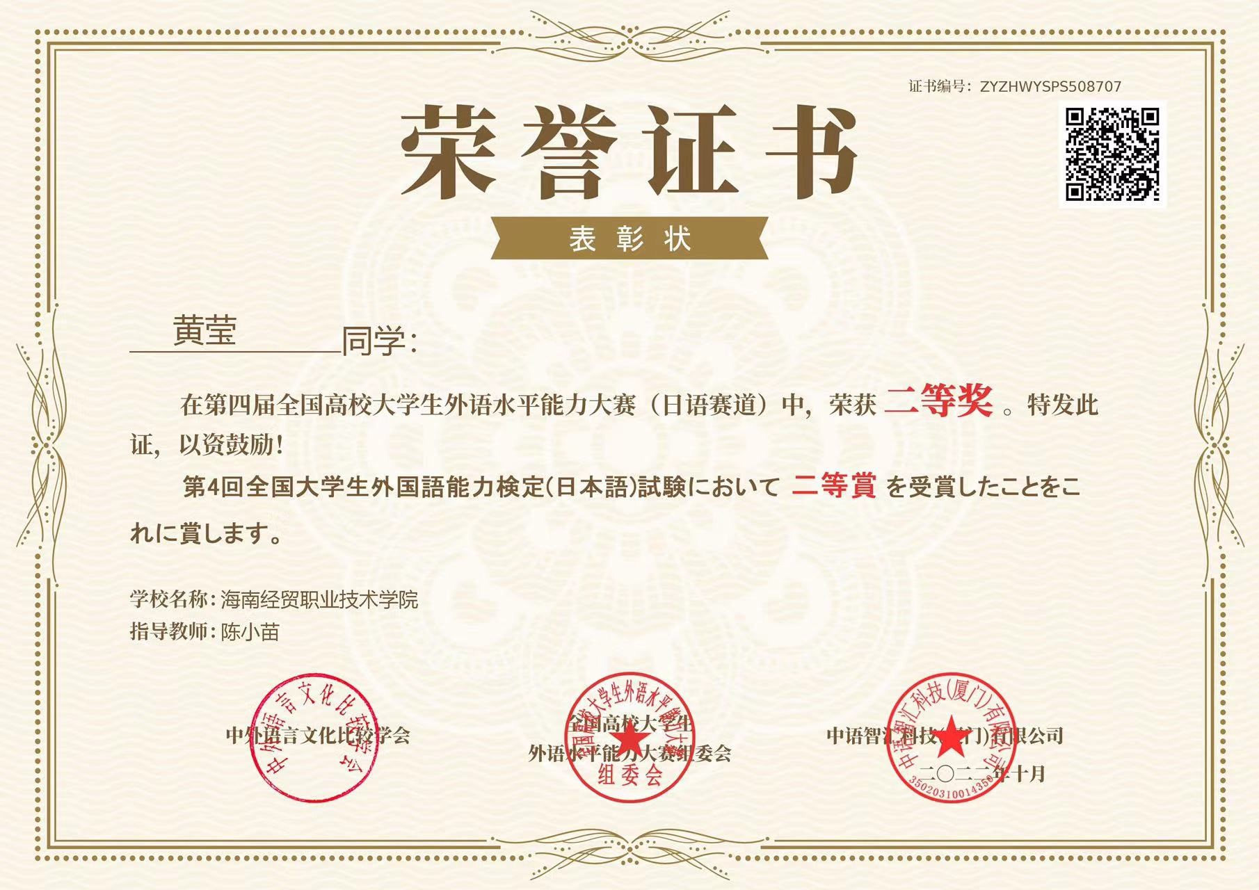 21级应用日语2班 黄莹 二等奖
