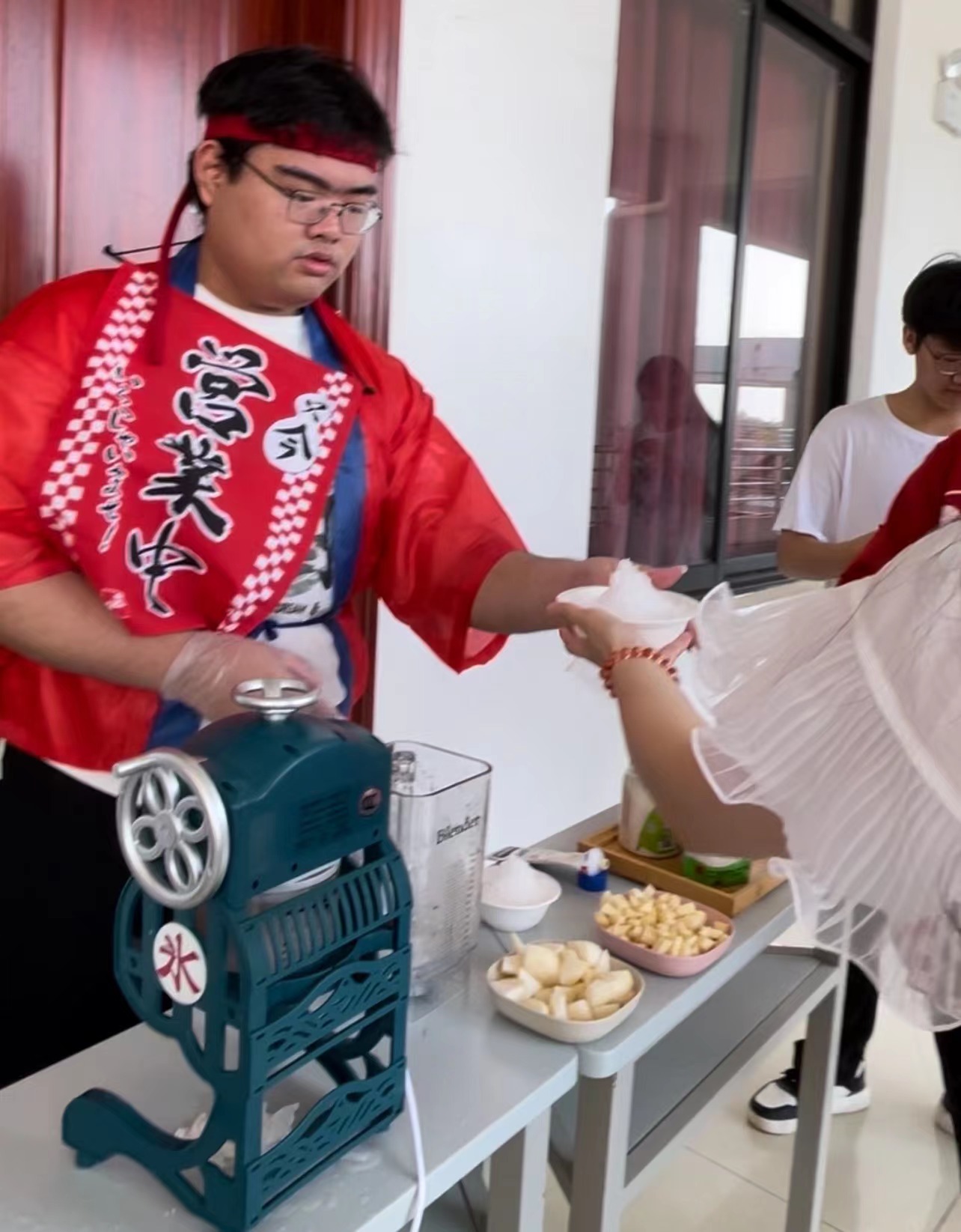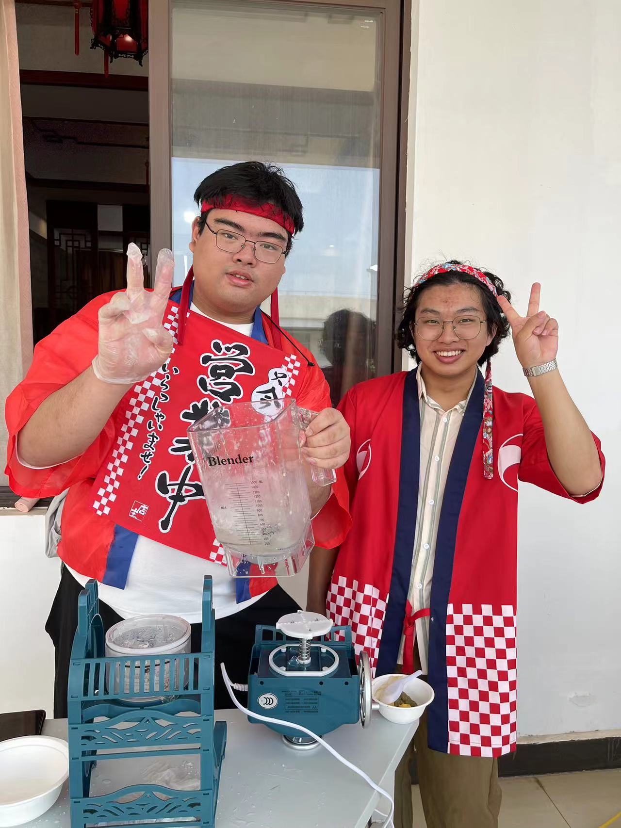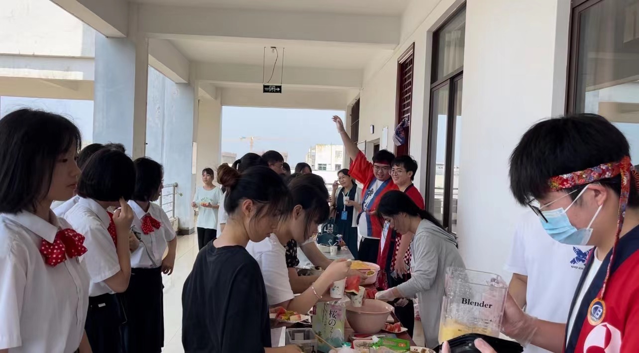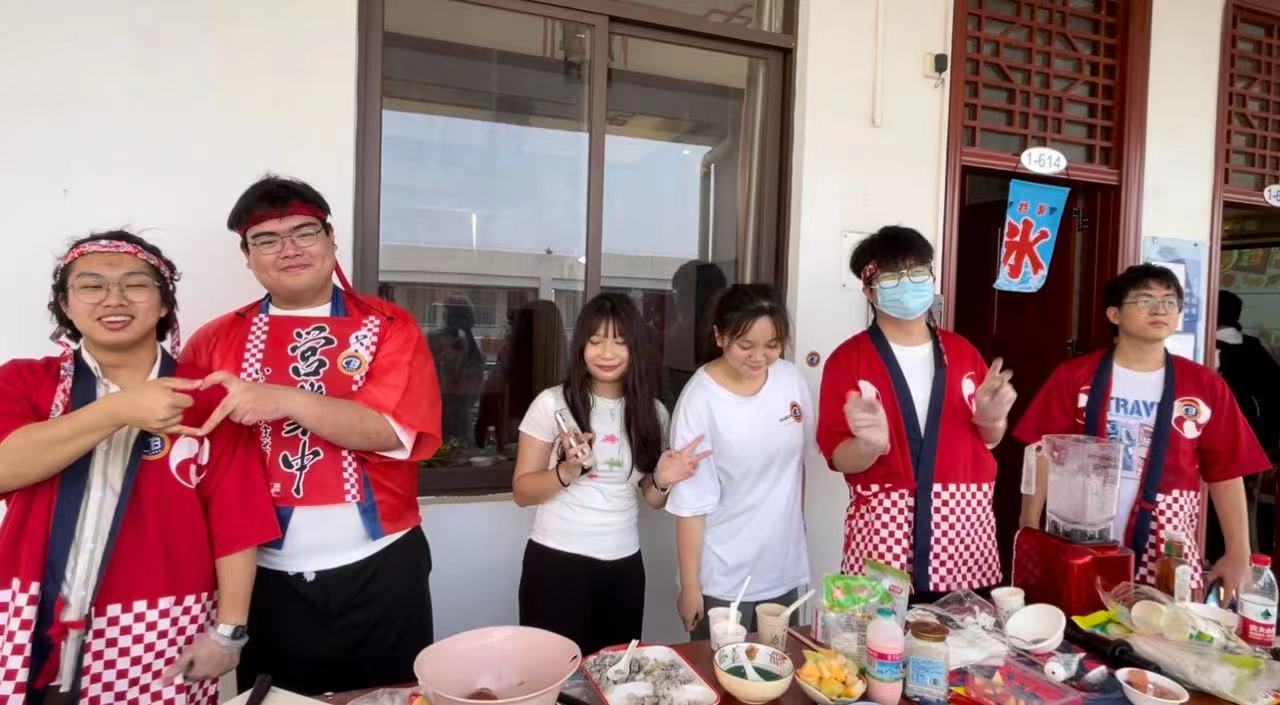 首先,同学们在1-614教室外搭建了日式刨冰摊位,摊位分为两个,一是传统刨冰摊位、一是果味刨冰摊位。在大家的努力和谷田老师的指导之下,刨冰志愿者们终于做出了酸甜适中、口味独特丰富、冰爽怡人的刨冰。炎炎夏日,在刨冰小组的同学们的吆喝声中,许多来参观体验日本文化的老师与员工光顾了我们的日式刨冰摊位,口味繁多的刨冰很快便供不应求,大家由起初的动作生疏逐渐转变成了配合默契。在忙碌之中,收获了众人的认可与赞美,更拥有了劳动的快乐。