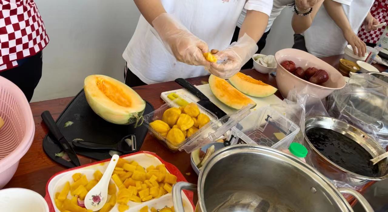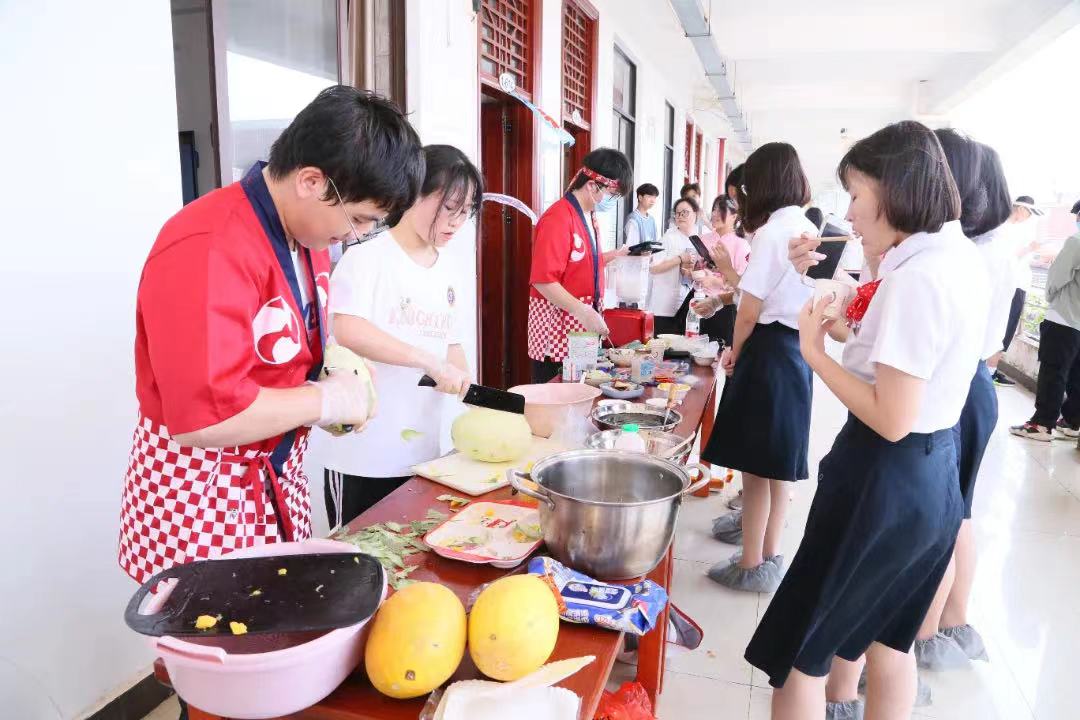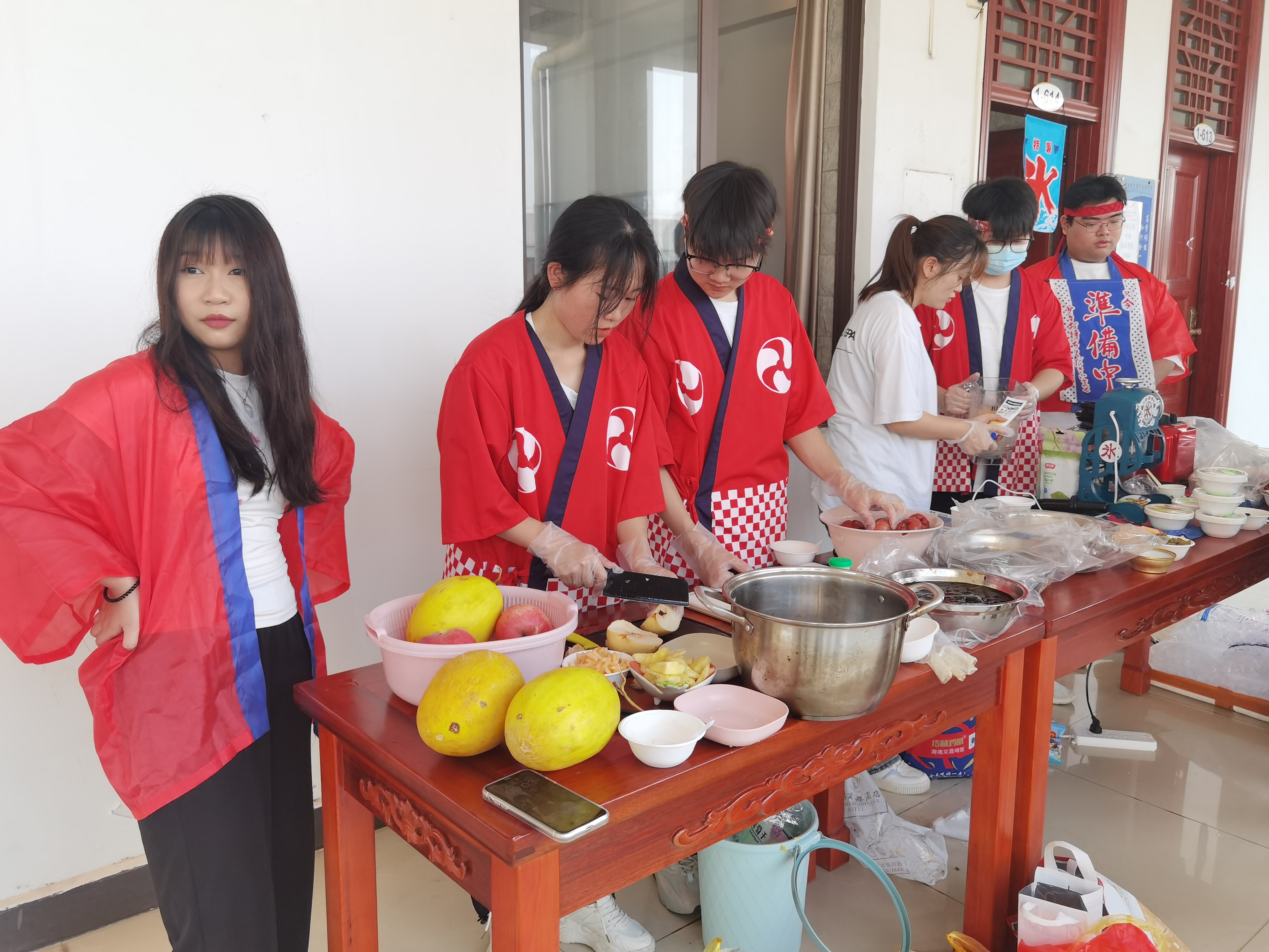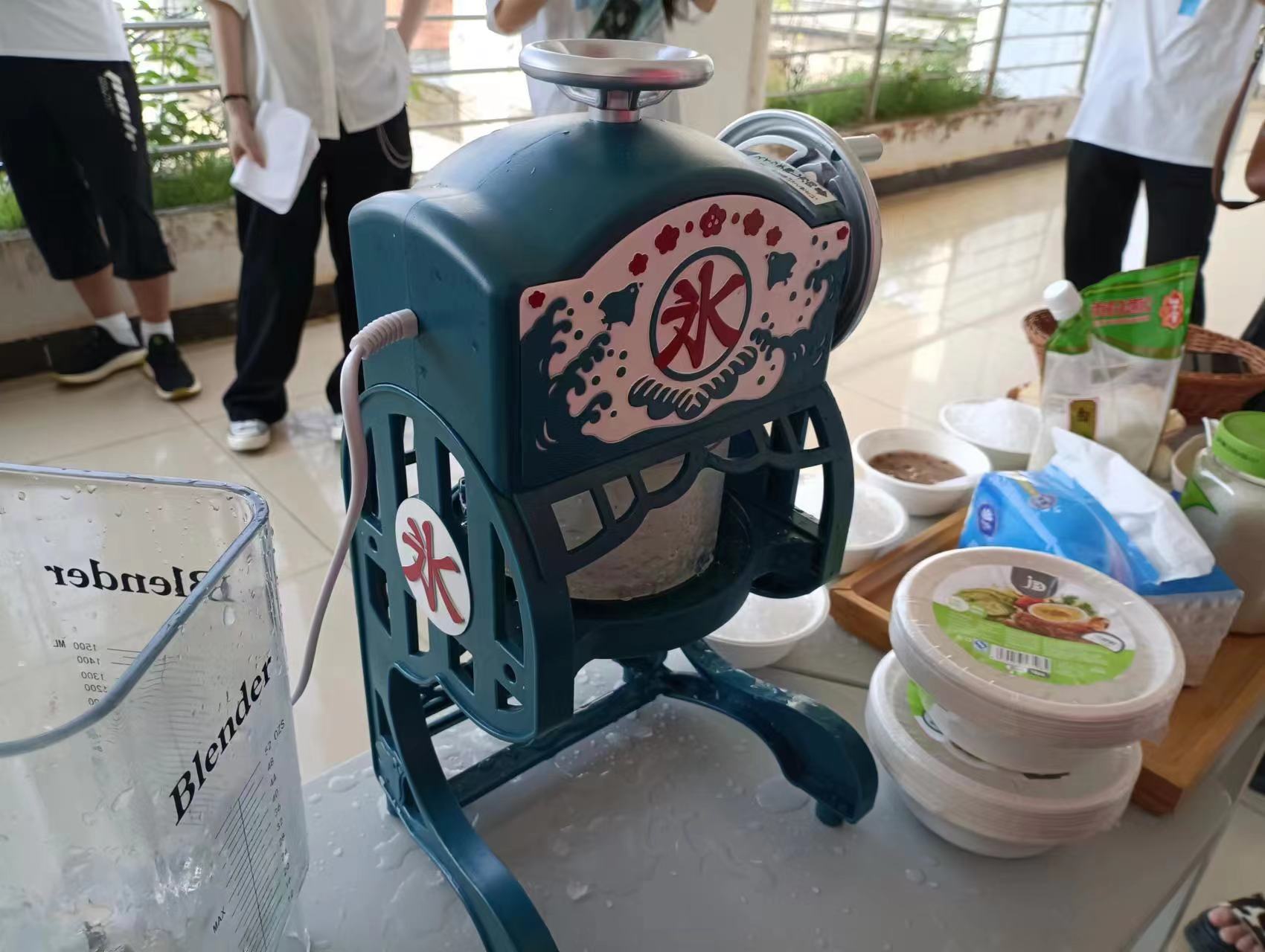 首先,同学们在1-614教室外搭建了日式刨冰摊位,摊位分为两个,一是传统刨冰摊位、一是果味刨冰摊位。在大家的努力和谷田老师的指导之下,刨冰志愿者们终于做出了酸甜适中、口味独特丰富、冰爽怡人的刨冰。炎炎夏日,在刨冰小组的同学们的吆喝声中,许多来参观体验日本文化的老师与员工光顾了我们的日式刨冰摊位,口味繁多的刨冰很快便供不应求,大家由起初的动作生疏逐渐转变成了配合默契。在忙碌之中,收获了众人的认可与赞美,更拥有了劳动的快乐。