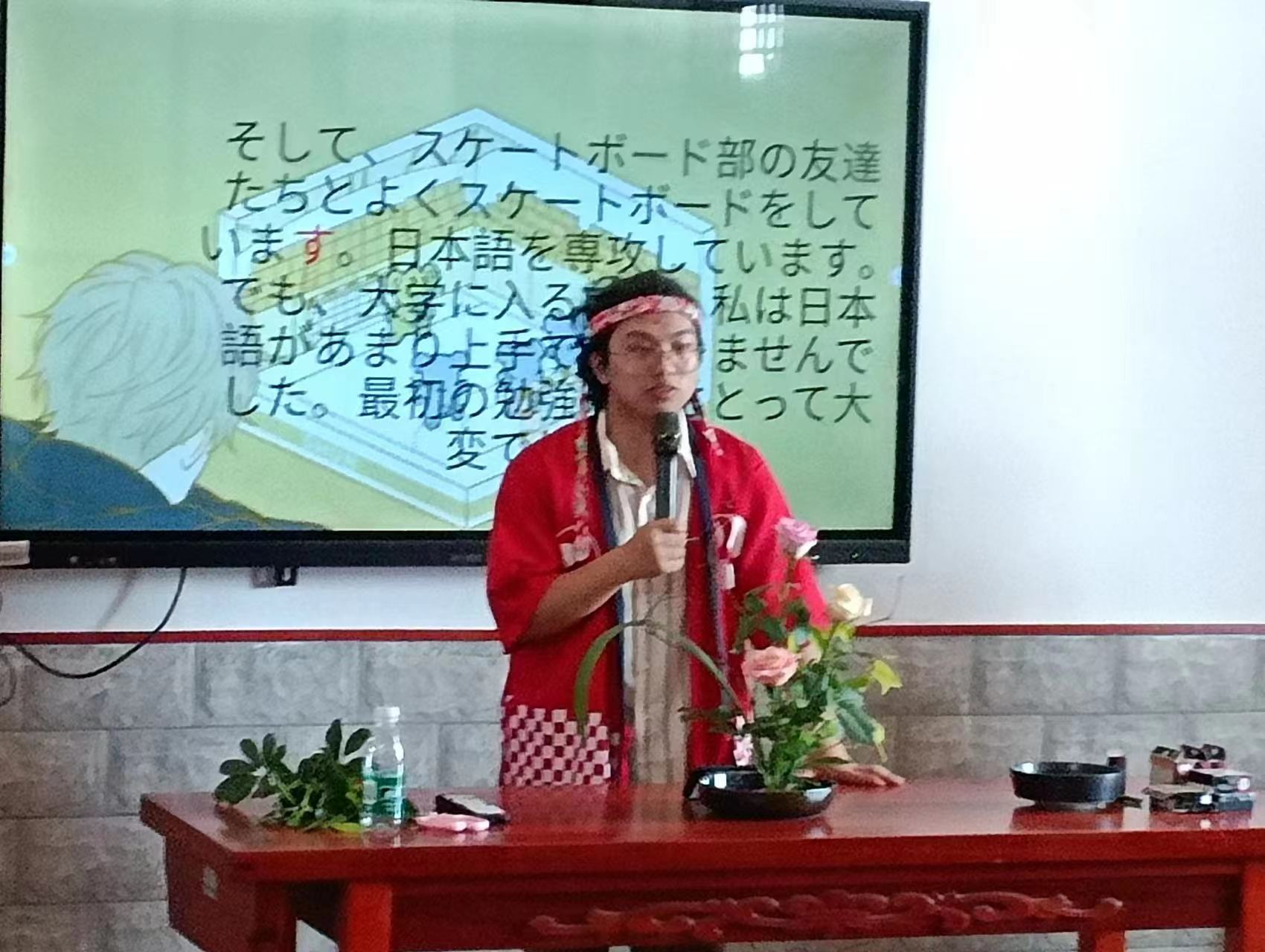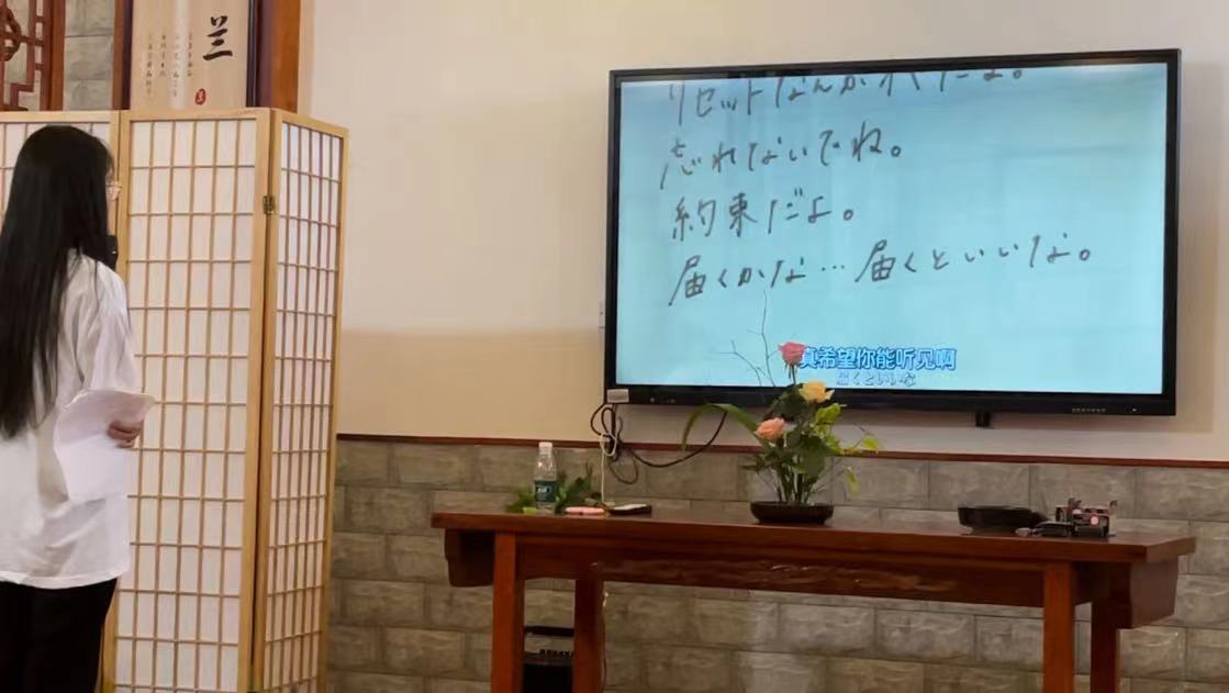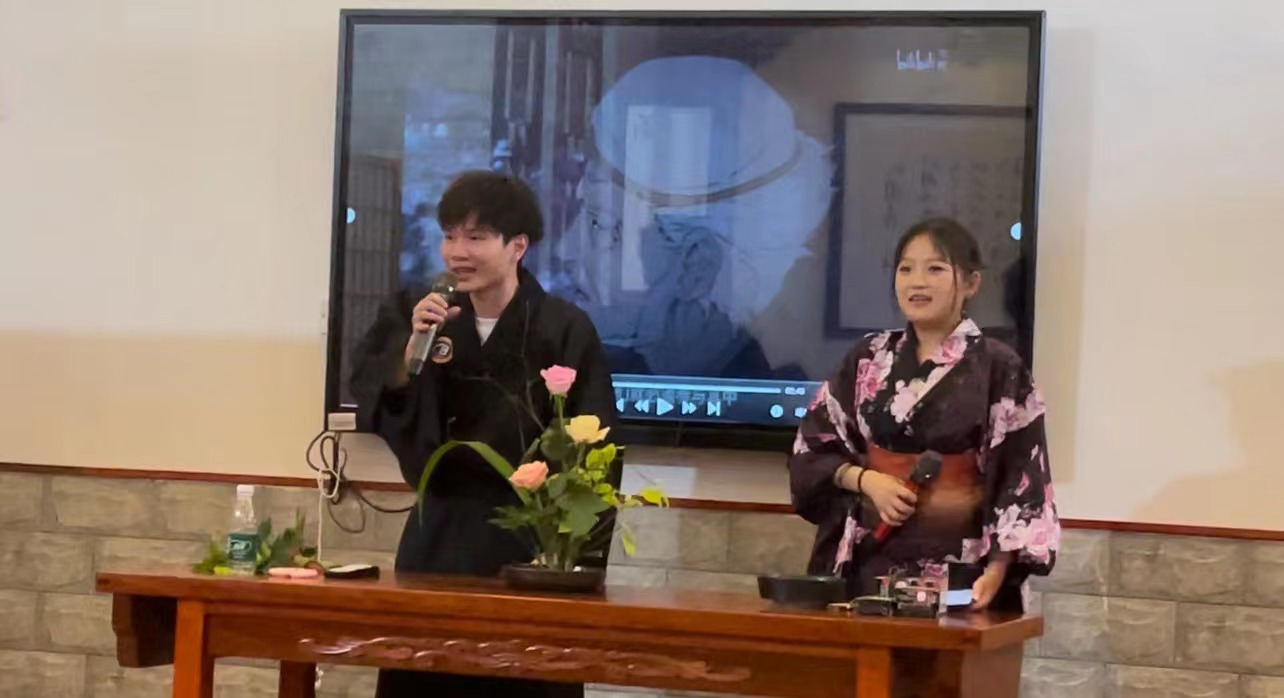 在海口旅游公司的员工前来614教室参加活动中,马娜为他们带去了激昂澎湃的日语演讲—《青春》。然后,林由惠老师为大家介绍了日本的插花艺术——華道,22日语1班张玉为林由惠老师担任日语翻译工作,精准而生动地为员工讲解插花艺术。