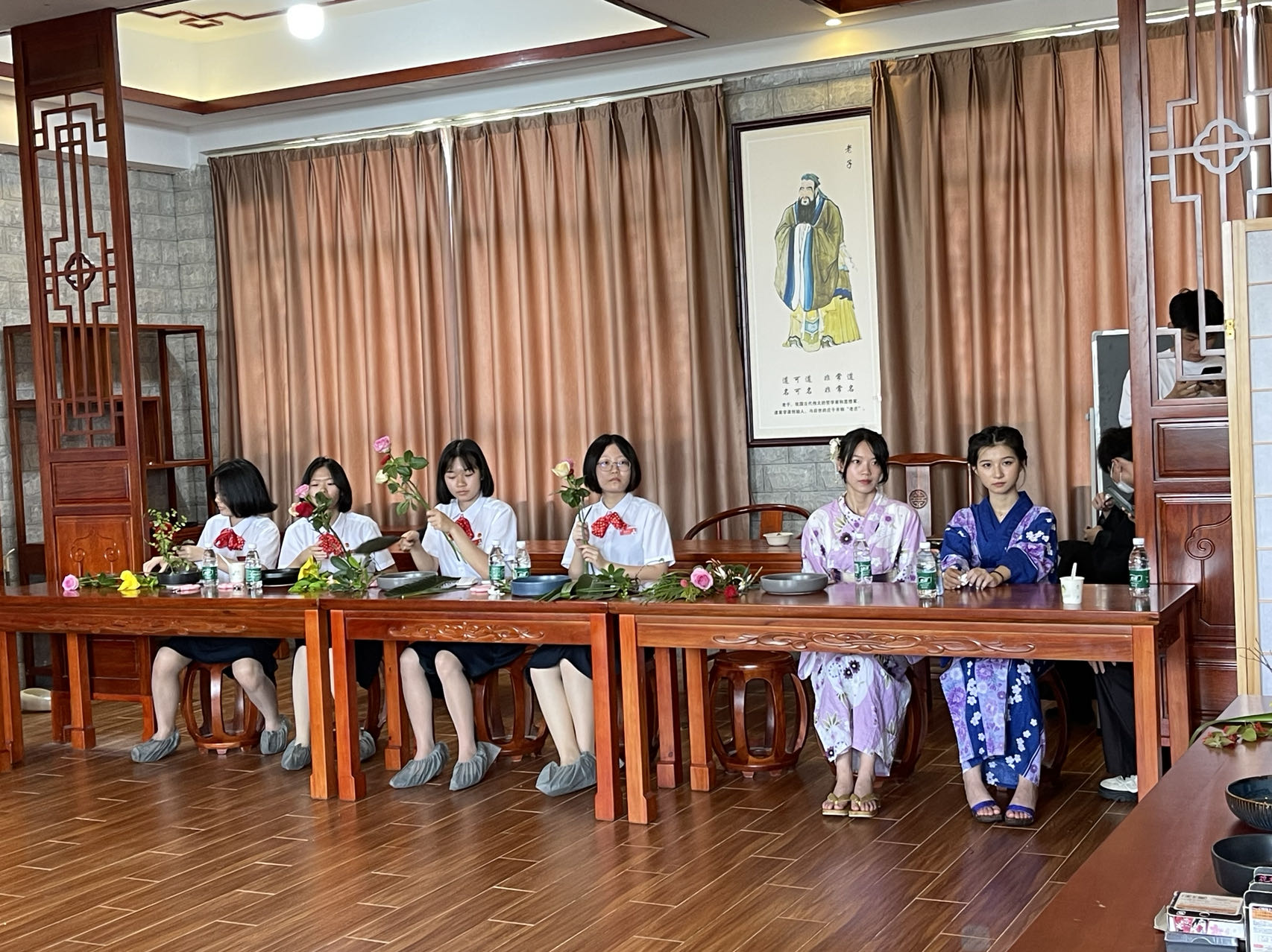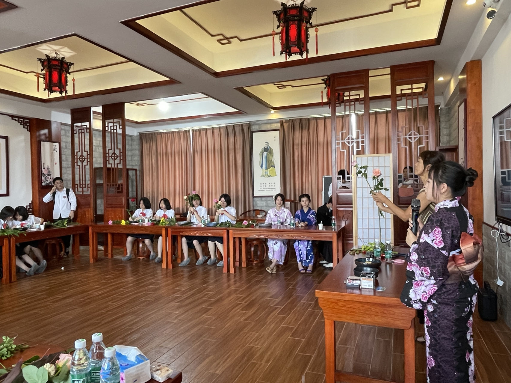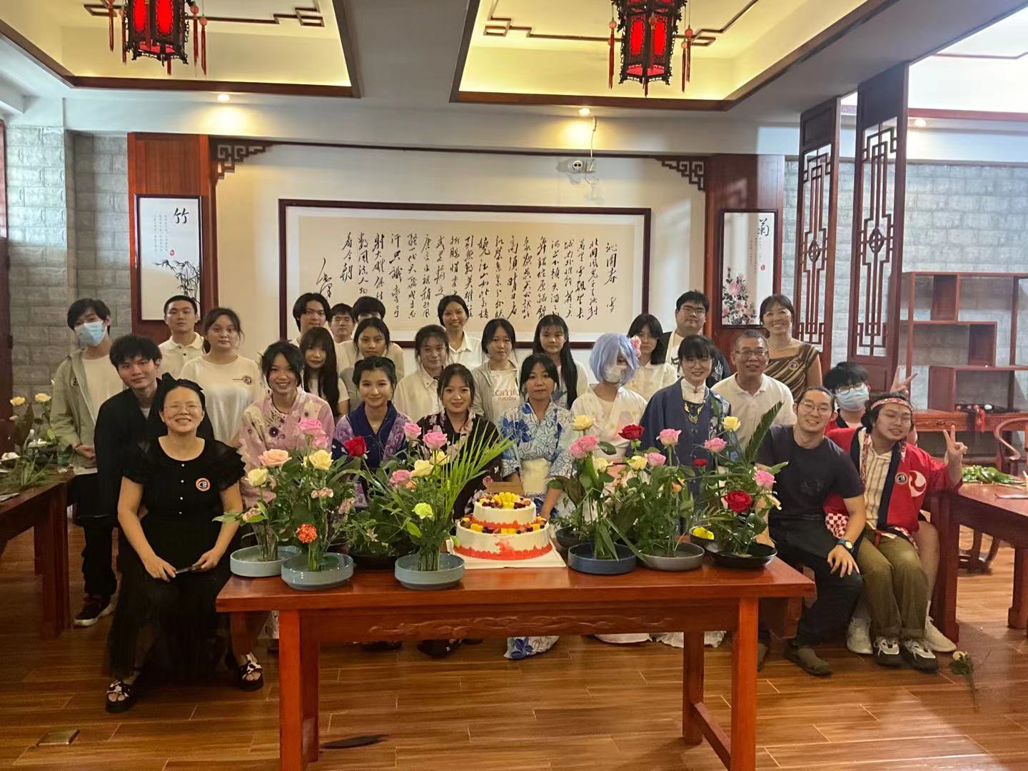 在海口旅游公司的员工前来614教室参加活动中,马娜为他们带去了激昂澎湃的日语演讲—《青春》。然后,林由惠老师为大家介绍了日本的插花艺术——華道,22日语1班张玉为林由惠老师担任日语翻译工作,精准而生动地为员工讲解插花艺术。