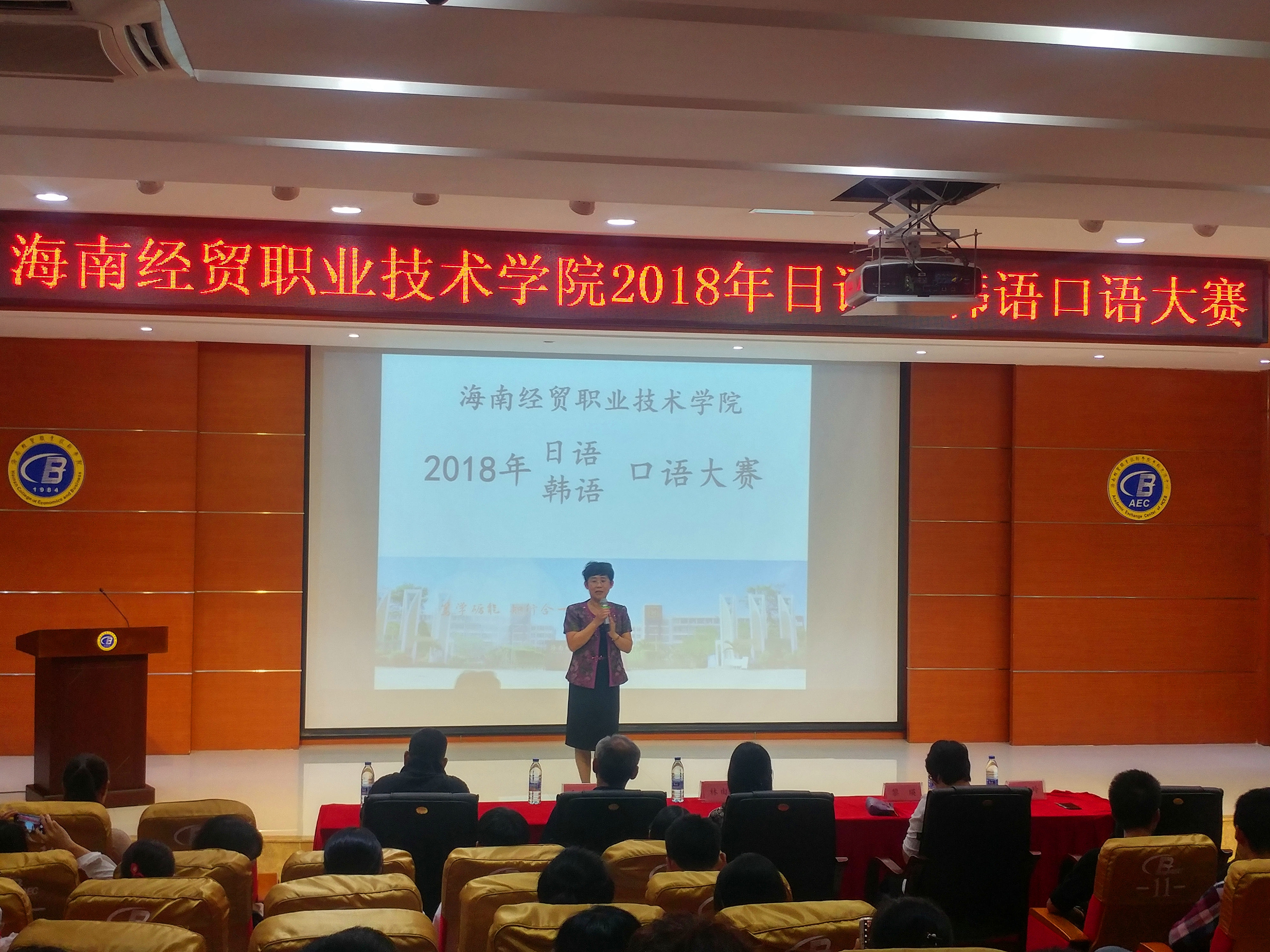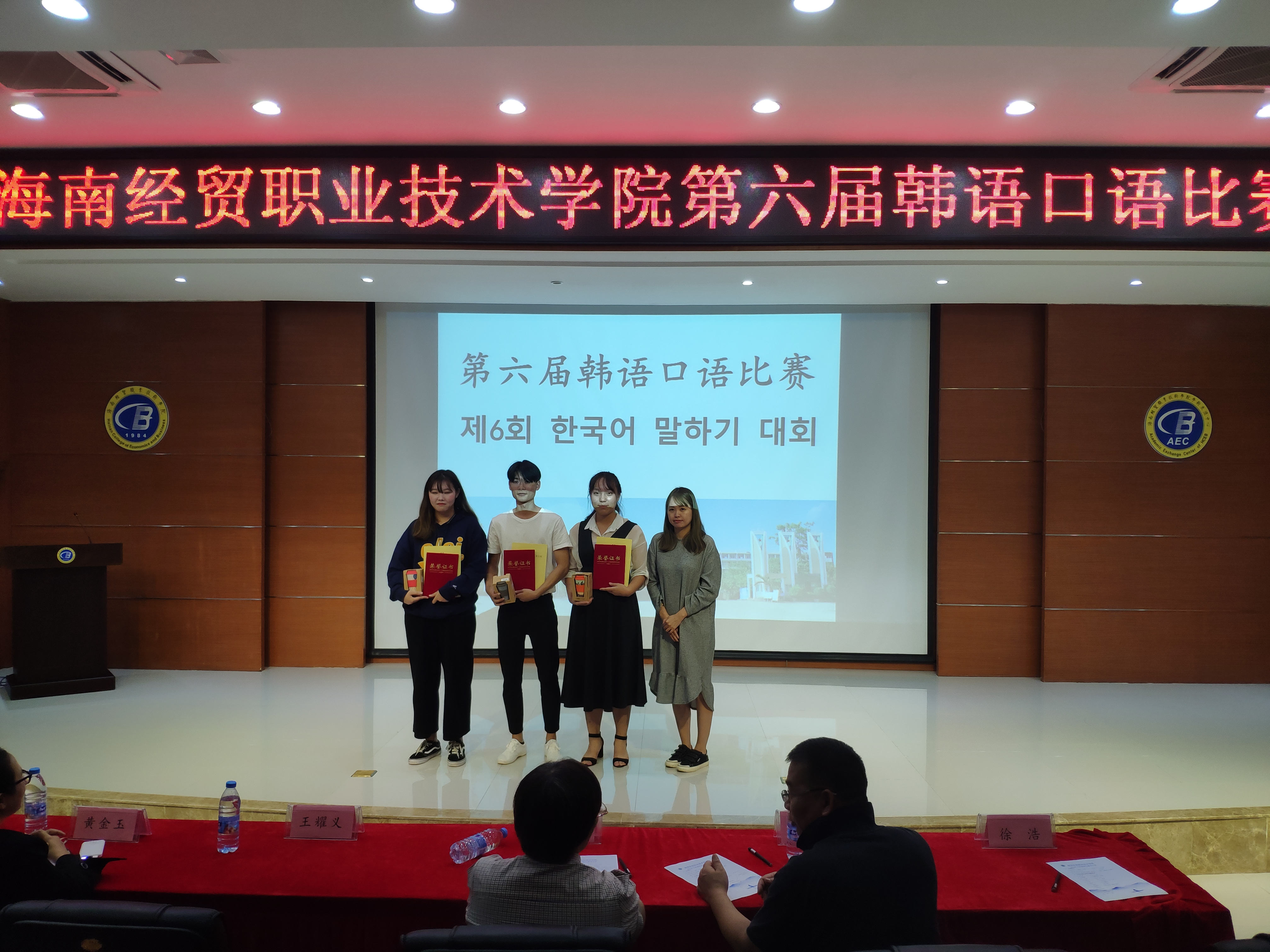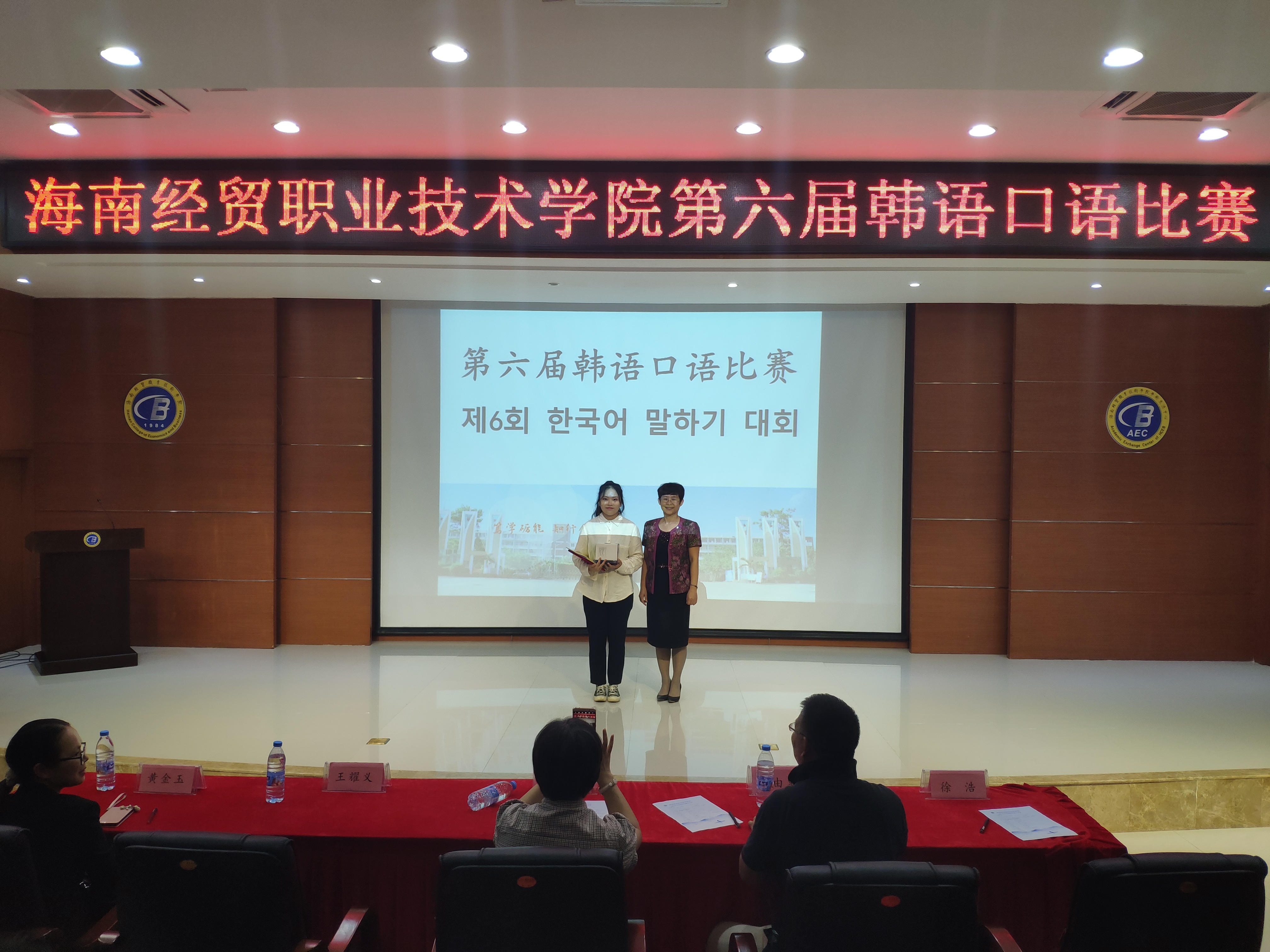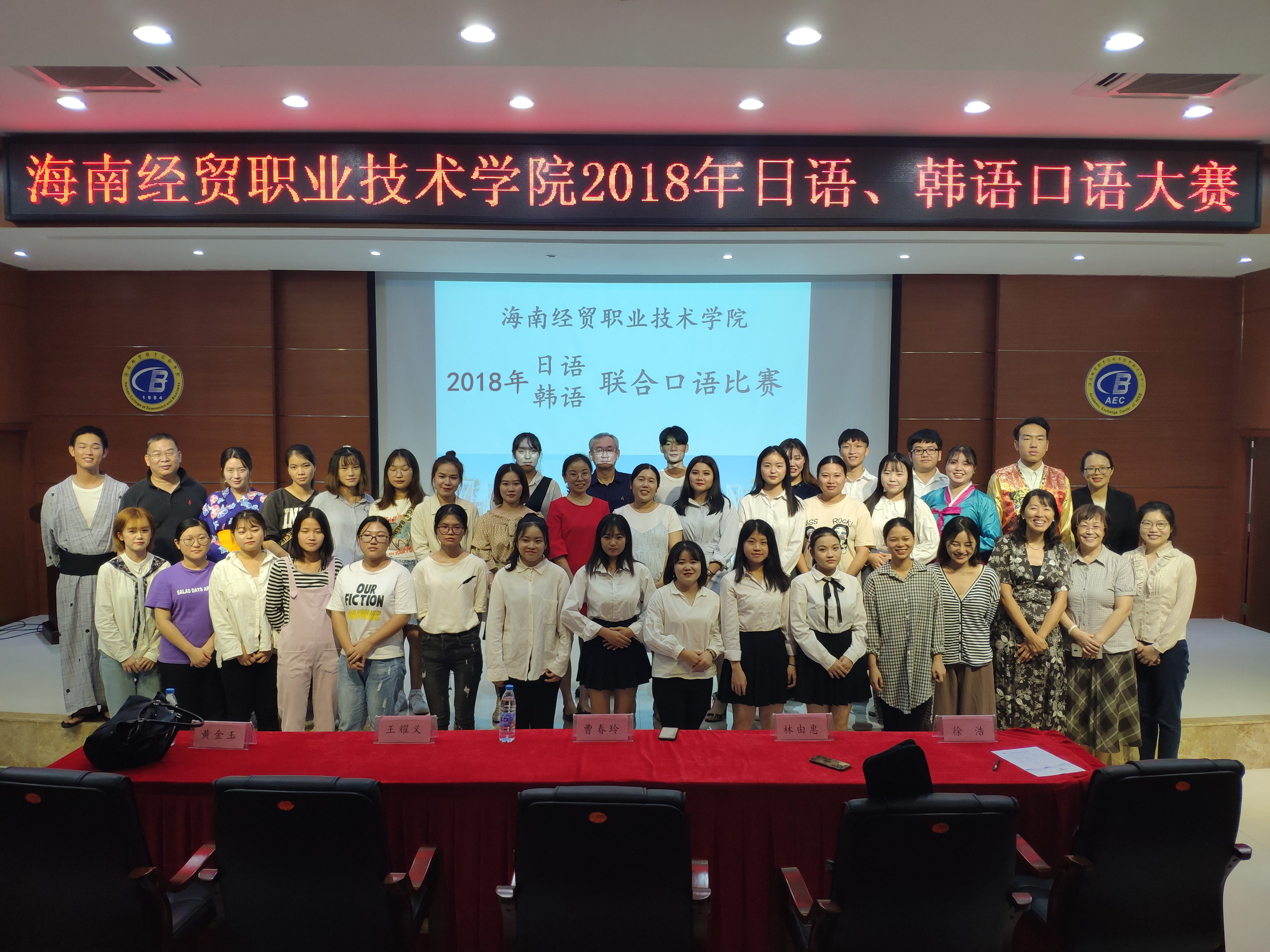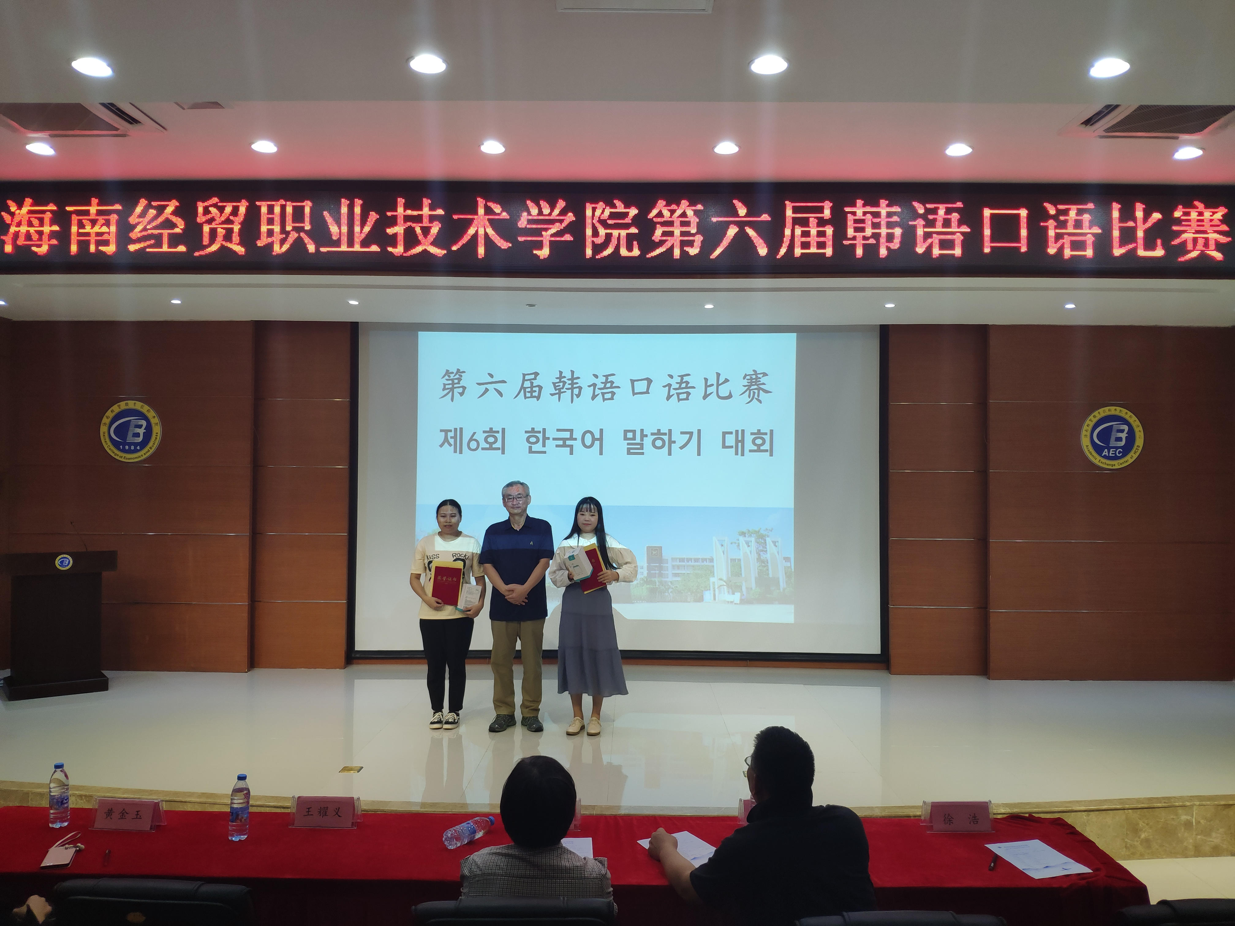 参加本次比赛的嘉宾有国际教育公司张春玲经理、黎瑛副经理;评委是来自海南师范大学的曹春玲教授,日语外教林由惠老师,韩语外教金永天老师以及本院应用日语和应用韩语专业的教师。