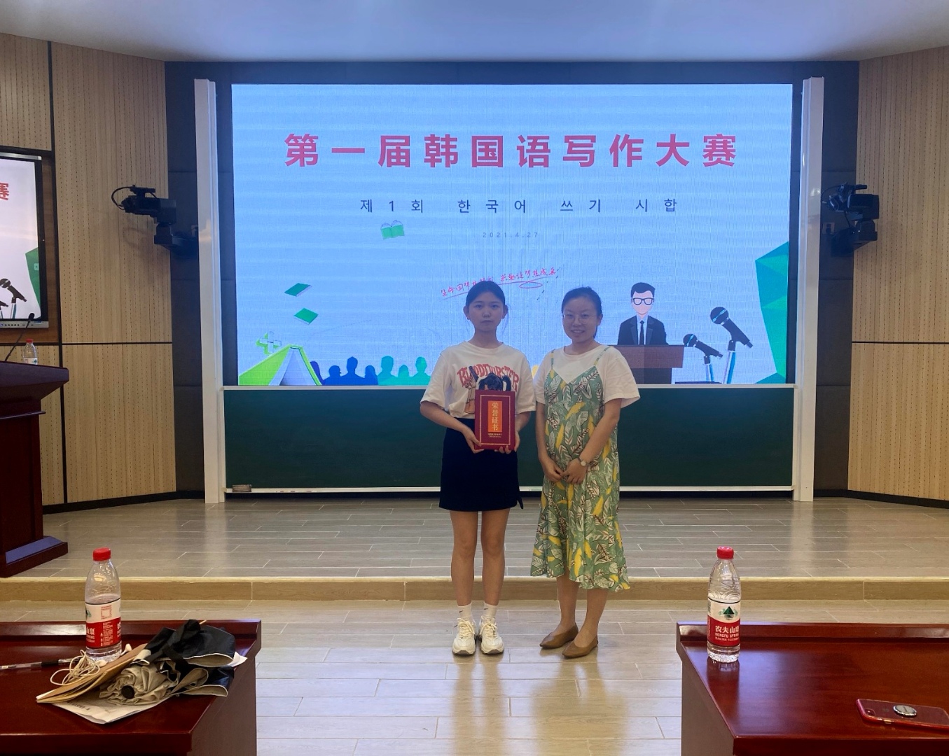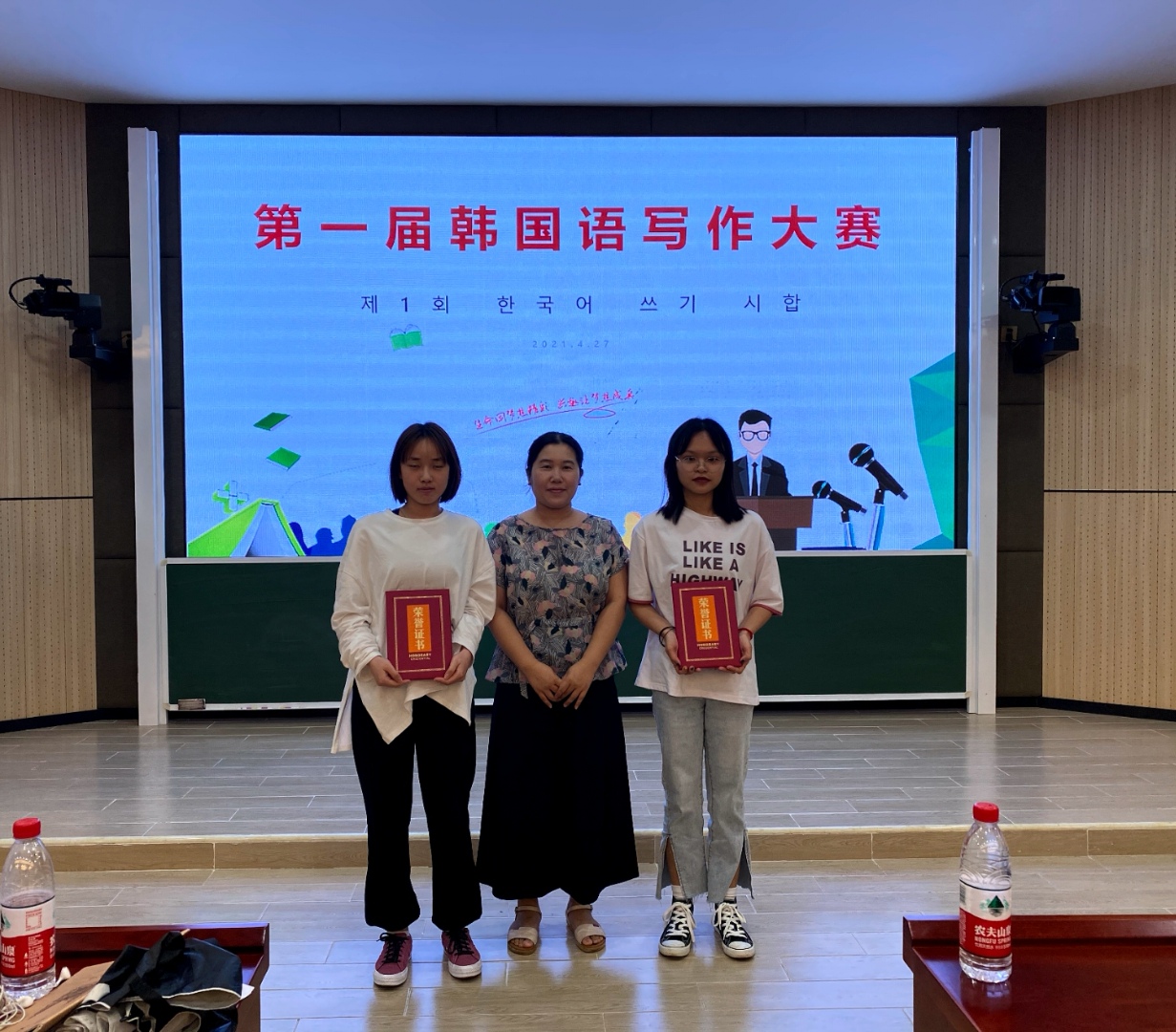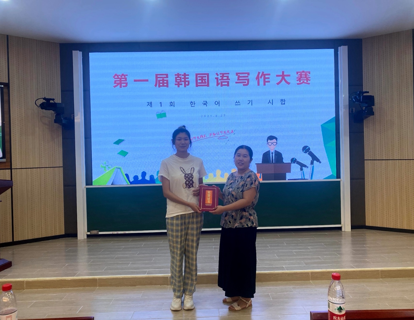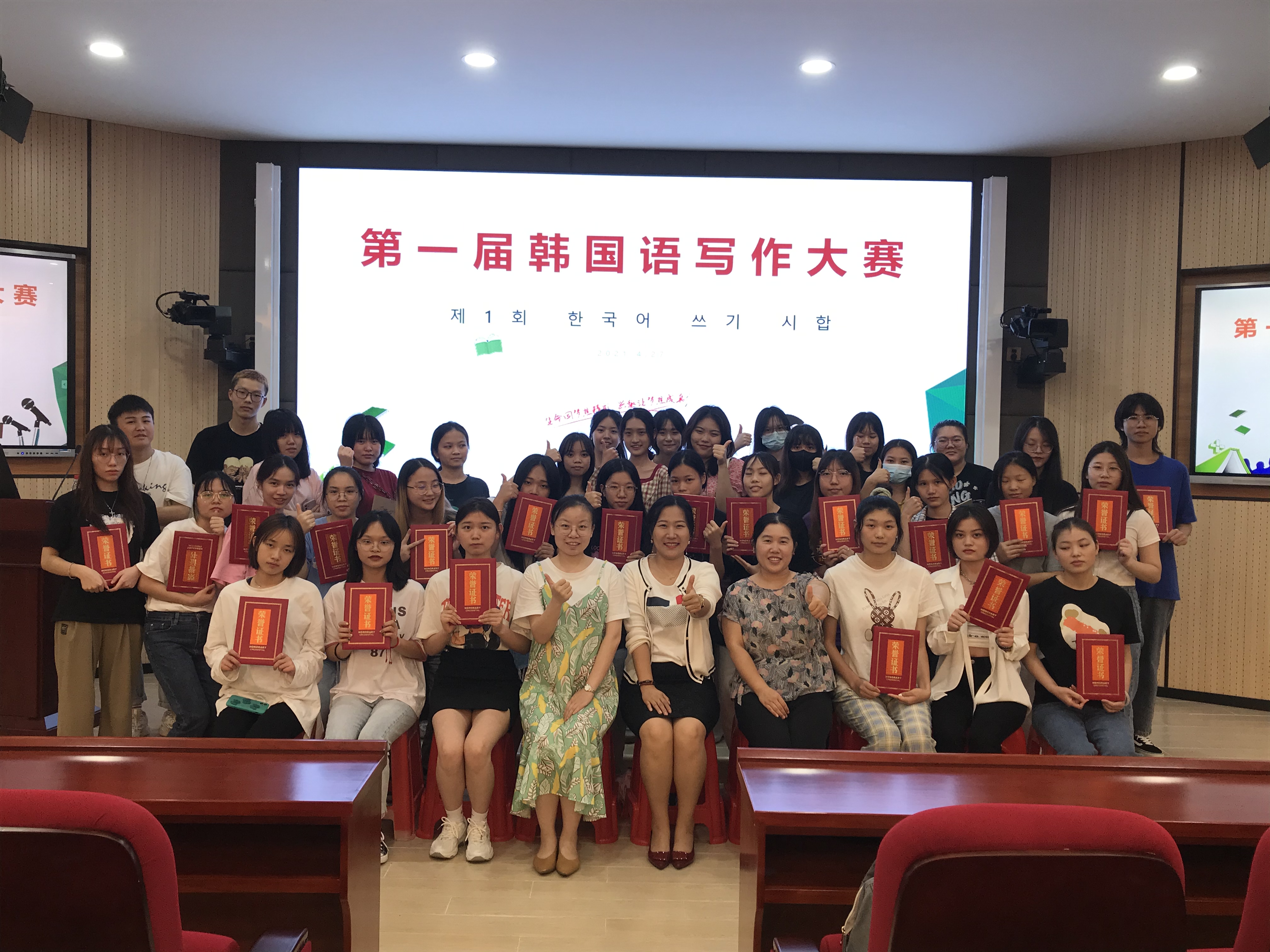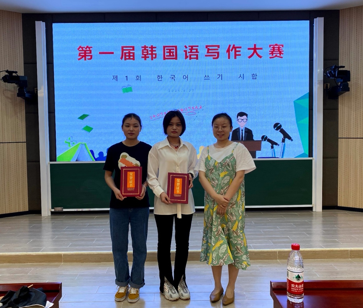 此次写作比赛为“四季”、“朋友”、“珍惜的物品”三个主题中选取之一进行写作。韩语专业41名员工报名参加竞选,在各展身手、文采飞扬下,2019级韩语2班文中张春敏同学和2019级1班马银红同学同时荣获一等奖荣誉。