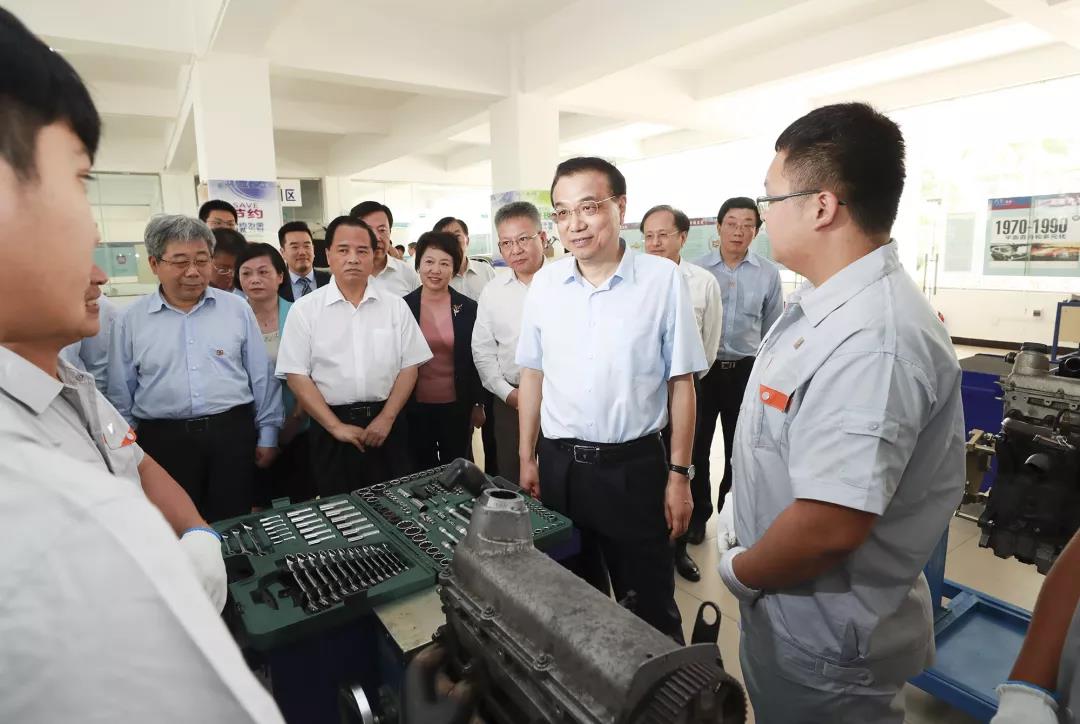 李克强总理3月27日上午到公司考察。今年《政府工作报告》提出,要改革完善高职院校考试招生办法,大规模扩招100万人。总理关心地询问扩招计划、团队及毕业生就业收入等情况,并与实训车间里进行发动机维修、钣金操作的员工深入交流。李克强勉励同学们说,国家不仅需要高端科研人才,也非常需要高技能人才,希望你们更加注重坚守专业精神、职业精神和工匠精神,努力顶起中国制造的脊梁。