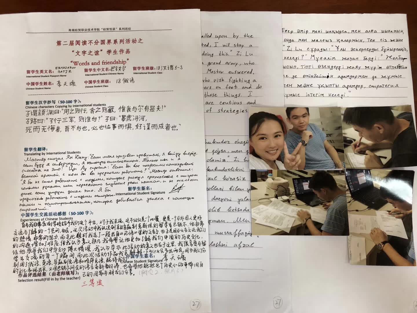 “俗话说得好,语言不分国界。这不,这次我和外国职工一起参加了我们公司图书馆举办的汉字不分国界比赛,并以优秀的成绩取得了二等奖!我本身是俄语专业的,平日里刻苦的学习,使得我的俄语水平已经能够和职工交流了,我的小伙伴是一位来自乌兹别克斯坦的小帅哥,他是我们公司学汉语的职工,学习成绩十分优异,汉语水平也很高,所以我们沟通起来很容易。这个比赛的主要内容是,和小伙伴一起选择一段心仪的文字,让职工摘抄下来。并翻译成自己的母语,而我需要做的就是协助他翻译,并且写下自己的感受,我起初想着光写文字,表面会显得很单调,刻板,所以我在纸张表面做了一些绘画,果然用心的付出,取得了优异的成绩,我们公司,总是会举行很多与俄语相关的一些比赛呀,活动啊!这对于学俄语的同学来说十分的有利!不仅可以丰富课外活动,还能与职工们一起互相学习,互相交流!”