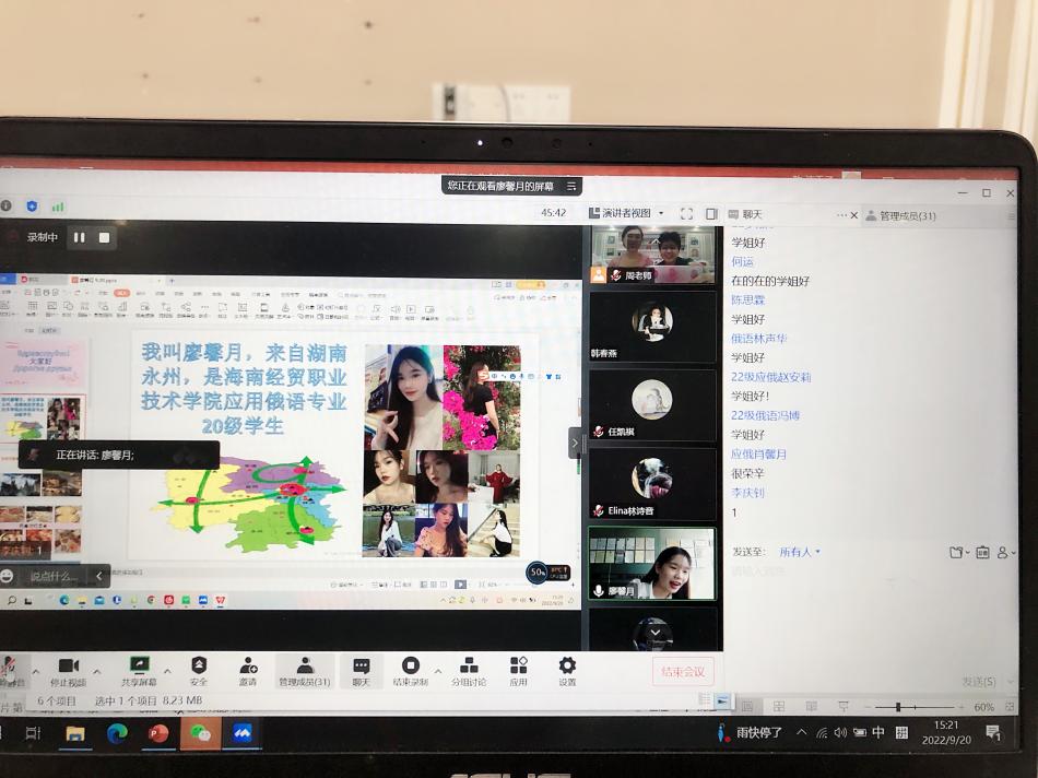 2022年9月20日俄语教研室采用线上线下相结合的方式举行2022级新生见面会,周丽霞副经理、俄语教师陈洁千子、外籍教师Anastasia、Iria在俄罗斯风情教室线下参会,俄语教师黄梓瑶、外籍教师Elina以及2022级全体应用俄语专业新生通过线上方式参加了本次见面会。本次会议还特别邀请到了19俄语班员工张琪、20俄语班员工廖馨月、海南贝加尔国际交流有限公司总经理15级俄语班李彬彬、南山迎宾馆前厅部经理14级俄语班刘小妹在线分享学习经验和行业前沿资讯。整场会面异彩纷呈,丰富多彩。