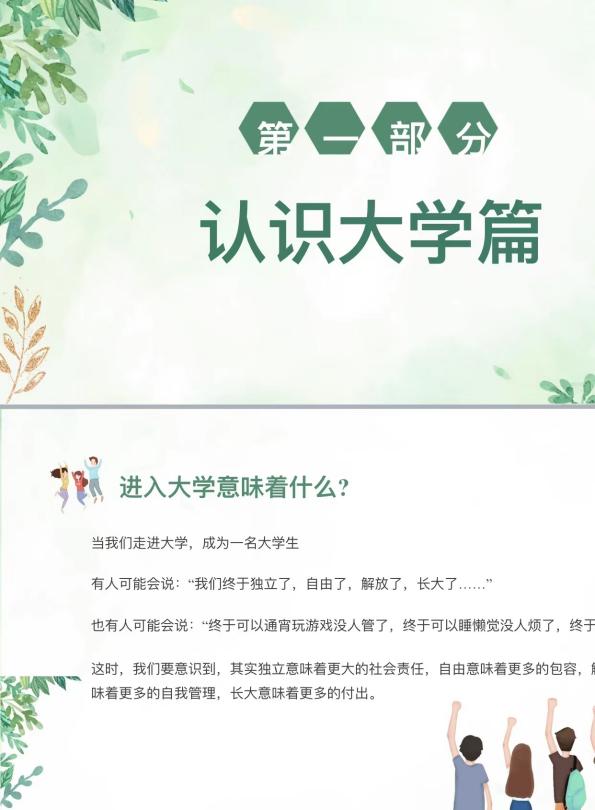 会议伊始,由黄梓瑶老师分享大学学习规划。黄老师从校园文化、公司概括、学习管理规定、道德与纪律、培养与学位规定等方面进行介绍,强调同学们在生活上要注意心理健康、消防安全、网络诈骗、沟通方式等,同时也要做好生涯规划,关注国家形势政策,选己所爱,择国所需。