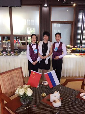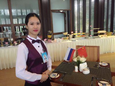 在博鳌亚洲论坛年会期间,俄罗斯代表团入住我们酒店。这时我也有幸被选入为俄罗斯代表团服务的列队中,巴厘岛俄罗斯早餐、俄罗斯国宴、俄罗斯海边冷餐宴等这些活动让我最近距离接触到俄罗斯人,感受俄罗斯人的文化。我用我最认真的态度,最美丽的微笑,最好的状态,还有蹩脚的英语和三两重的俄语,一心想着要为这些俄罗斯高层领导们提供最周到的服务。在宴会中,我真切感受到了俄罗斯人的友好、亲和,他们会很有礼貌地对我微笑,主动向我打招呼say hello!他们对我给予的帮助连连感谢,他们对我的尊重让我完全感觉不到富豪们的傲慢 ,高层阶级对低层阶级的俯视感。这些领袖们不仅有涵养而且也很可爱,他们会唱歌会跳舞,会对我做鬼脸会开小玩笑,我安安静静地看着他们心中却喜悦澎湃汹涌。