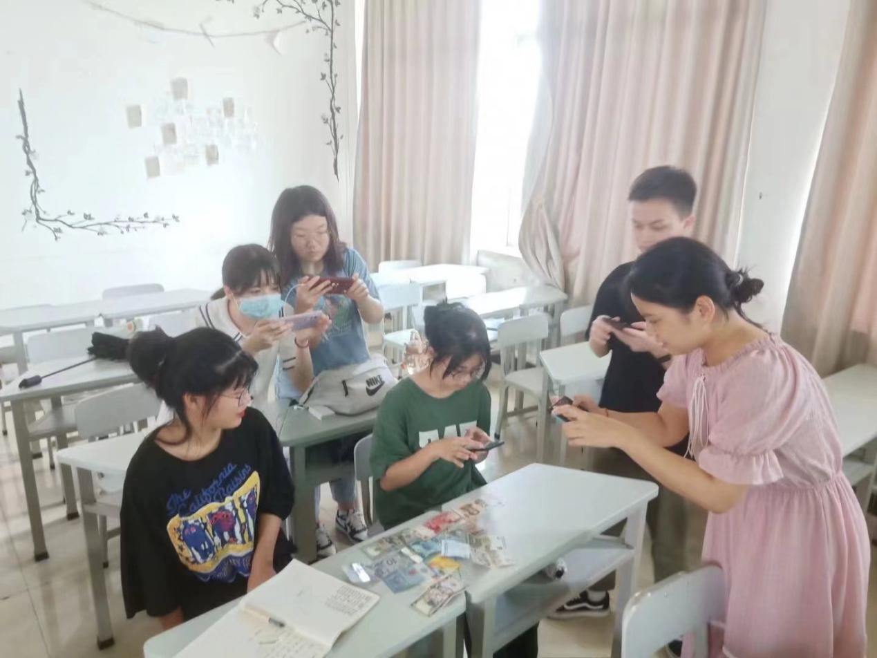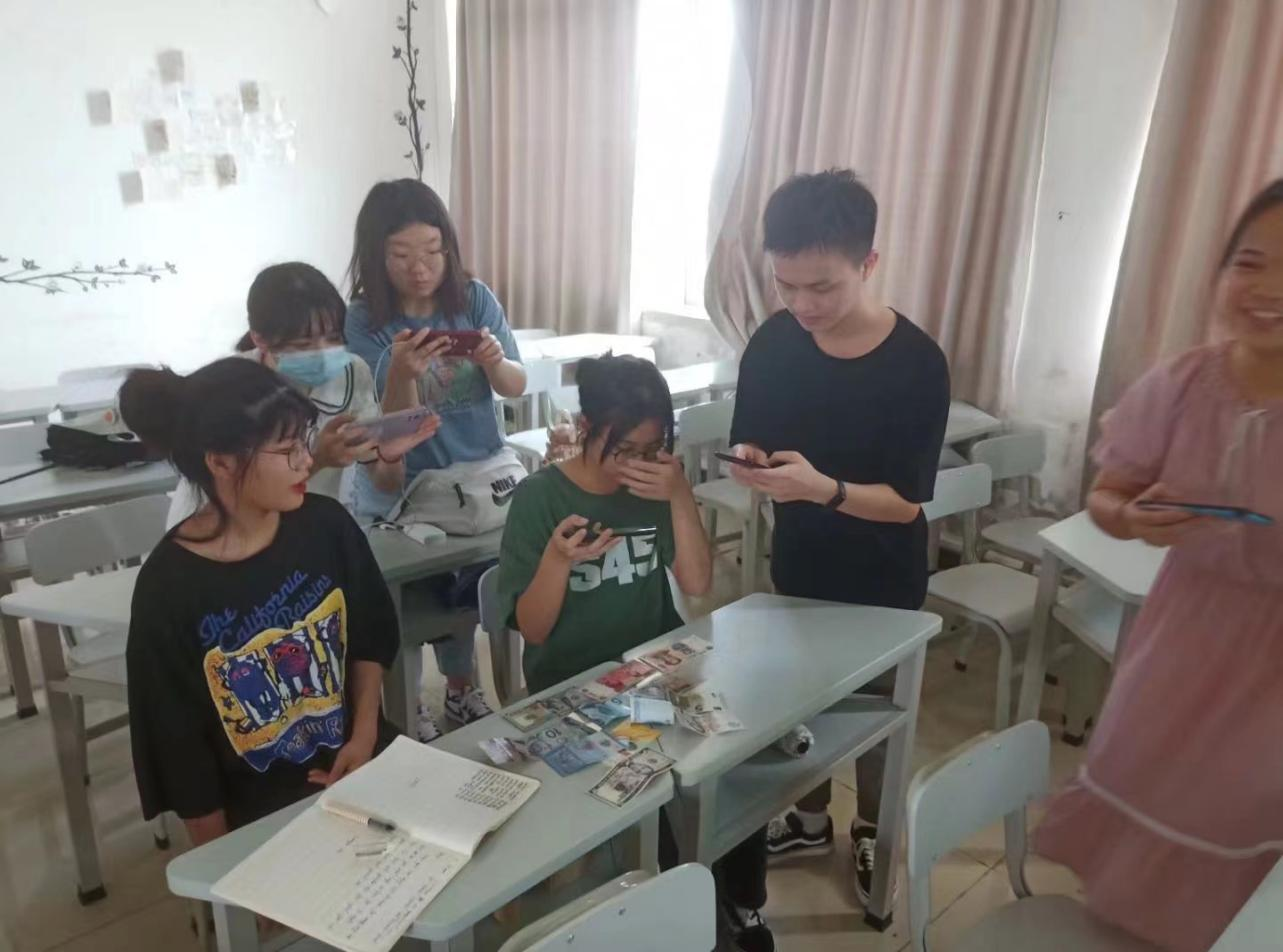 同学们看到各国货币感到很兴奋,纷纷从口袋里掏出手机拍照。