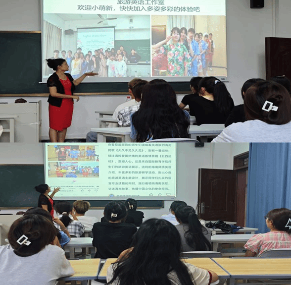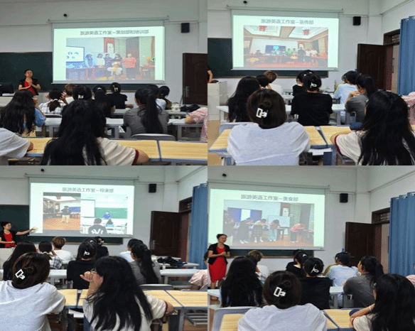 见面会现场,气氛热烈而愉快。新成员们带着好奇与期待,眼神中闪烁着对未来的憧憬。随着大家纷纷落座,何春老师老师走上了讲台。老师微笑着,如同一位智慧的引路人,开始为大家讲解旅游英语工作室的发展历程以及介绍相关部门。有的部门负责组织精彩的英语剧活动,让大家在轻松愉快的氛围中提升口语表达能力;有的部门专注于策划专业的旅游知识讲座,为大家打开了解世界的窗户;还有的部门精心筹备美食部分,给大家带来不一样的体验。旅游英语工作室从最初的小小萌芽,到如今的茁壮成长,每一个阶段都充满了故事与挑战。老师的讲述生动而精彩,仿佛带着大家穿越时光,一同见证了工作室的诞生、成长与辉煌。我们仿佛看到了那些曾经为了梦想而努力奋斗的身影,听到了那些充满激情的讨论声,感受到了每一次成功的喜悦。