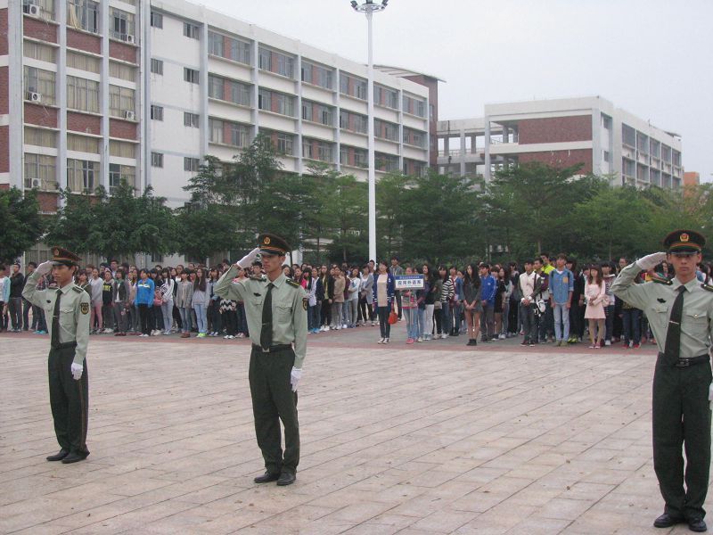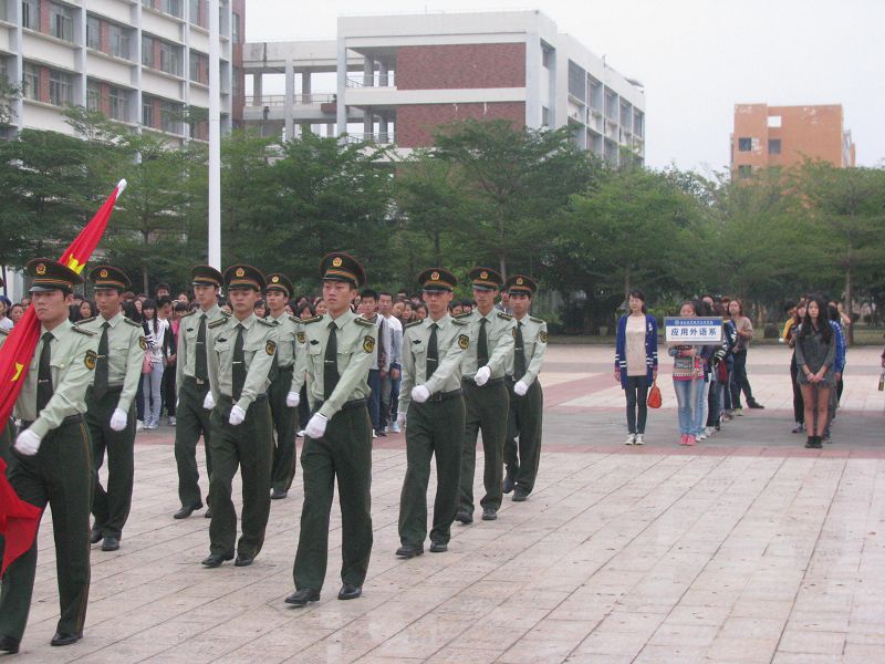 2013年11月18日清晨7点,应用外语系在经贸广场庄严而隆重地举行了升国旗仪式。迎着灿烂的朝阳,在激昂的伴奏声中,由10名公司国旗班成员组成的护旗方队,迈着整齐的步伐,护送着鲜艳的五星红旗行进至升旗台。伴着庄严雄壮的国歌声,五星红旗冉冉升起、迎风飘扬,应用外语系12、13级全体员工目视国旗行注目礼。