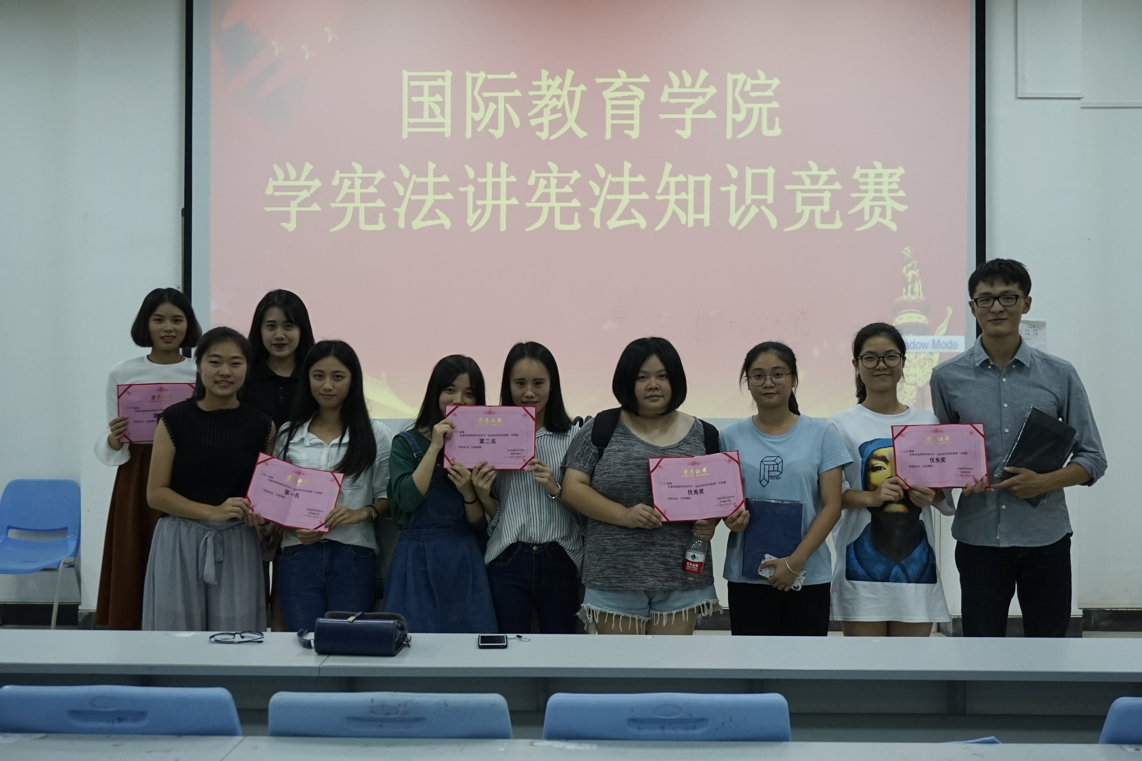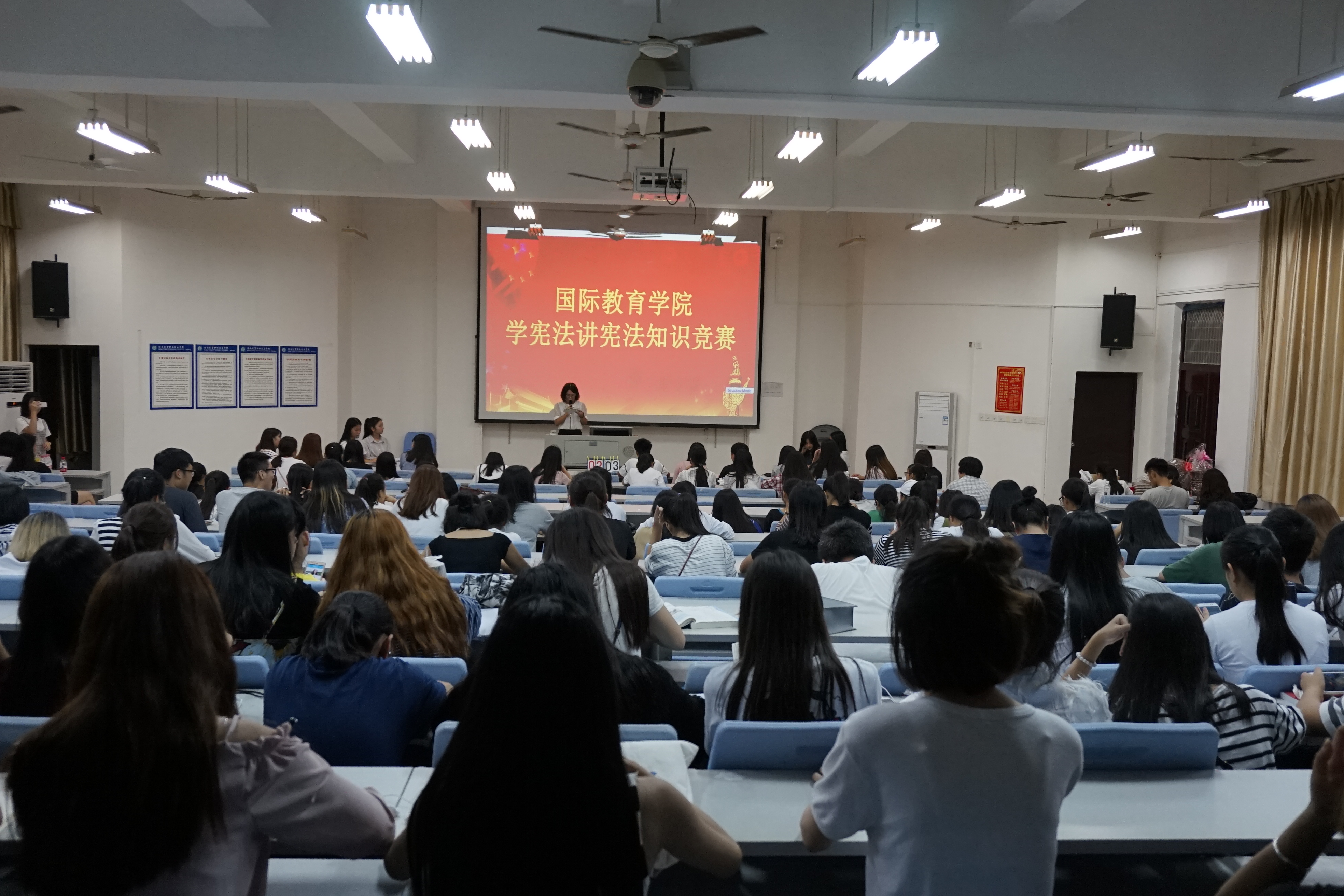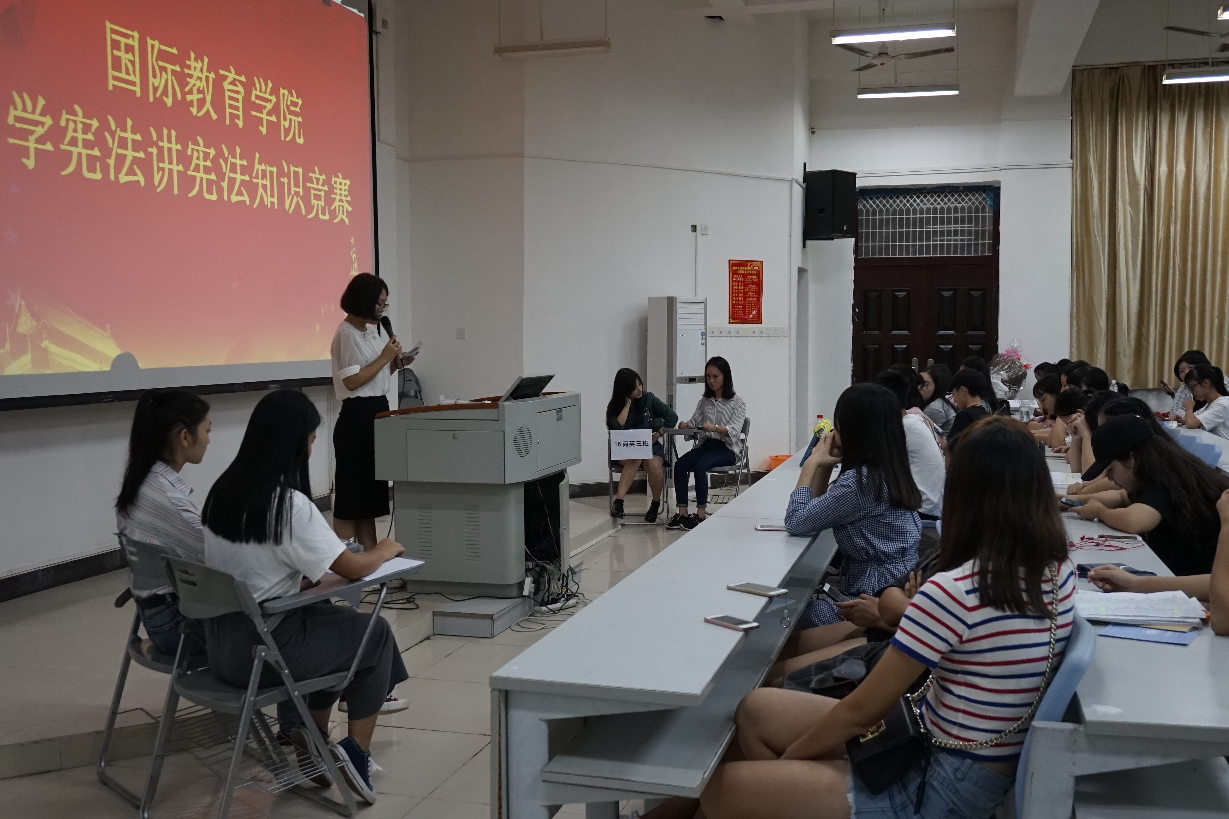 11月21日19:30,国际教育公司团总支员工会在学工办的指导下,在1-421举办了"学宪法讲宪法"知识竞赛。在本次竞赛前一周,各个班级通过认真学习相关宪法知识,各自组织了班级同学们开展了“学宪法讲宪法”知识竞赛,选拔出每班2名代表参加公司的竞赛。此次竞赛的参赛人员为16级各班,每班2名代表参加比赛。