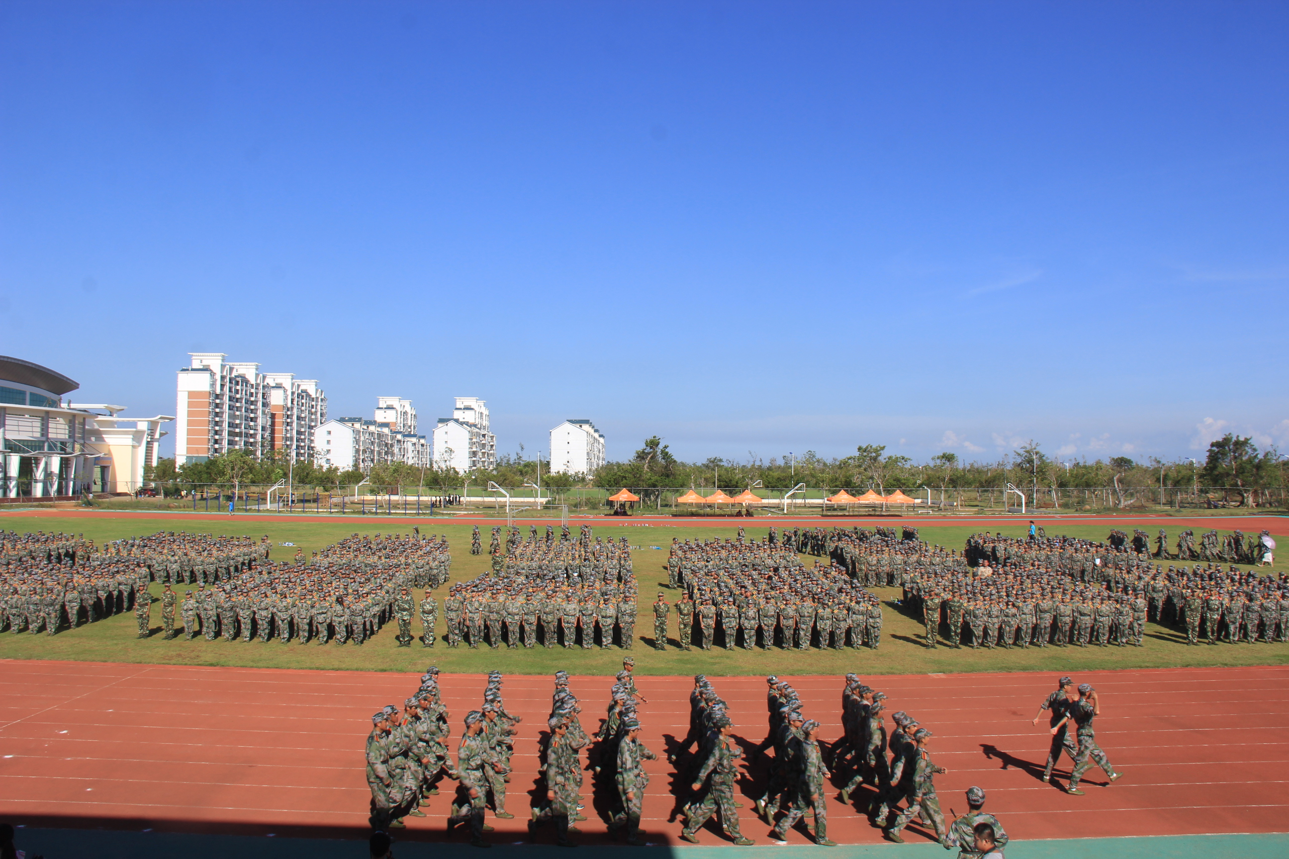 这一天下午3.00当太阳还在火辣辣的照着大地的时候,14级的新生们早已穿戴着整齐的迷彩服,早早的来到了海经贸的体育场上半小时后,新生军训汇报表演正式开始,他们踏着整齐的步伐,喊着响亮的口号,尽管火热的太阳照的他们汗流浃背,但他们然不管不顾,严格遵守教官要求,认真着动作!豆大的汗珠顺着额头流下来,他们也毫不在乎!