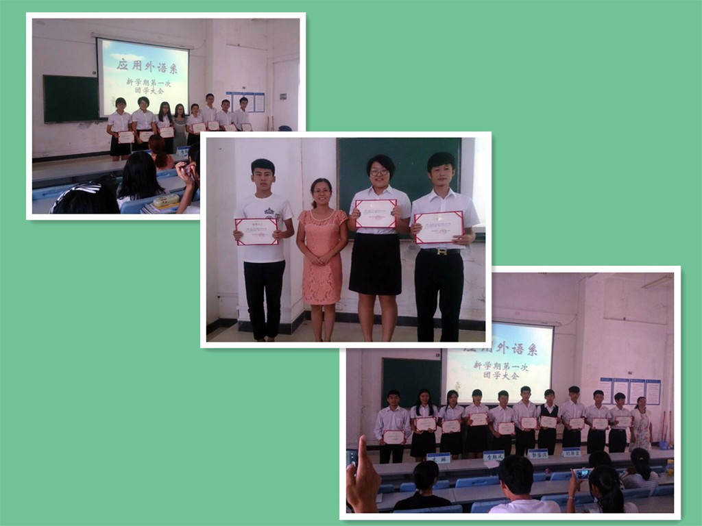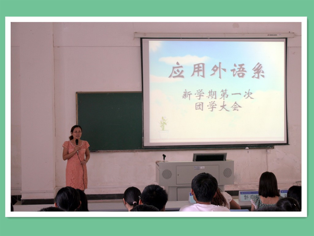 2014年10月17日中午12点,bevictor1946韦德官网应用外语系在教学楼1--103隆重举行了“应用外语系新学期首次团学大会”,出席本次大会的有应用外语系党总支书记朱琳,系团总支书记郭蓉佳,系就业干事李转风,系实习辅导员刘羿显,以及团总支员工会各部门的员工干部。