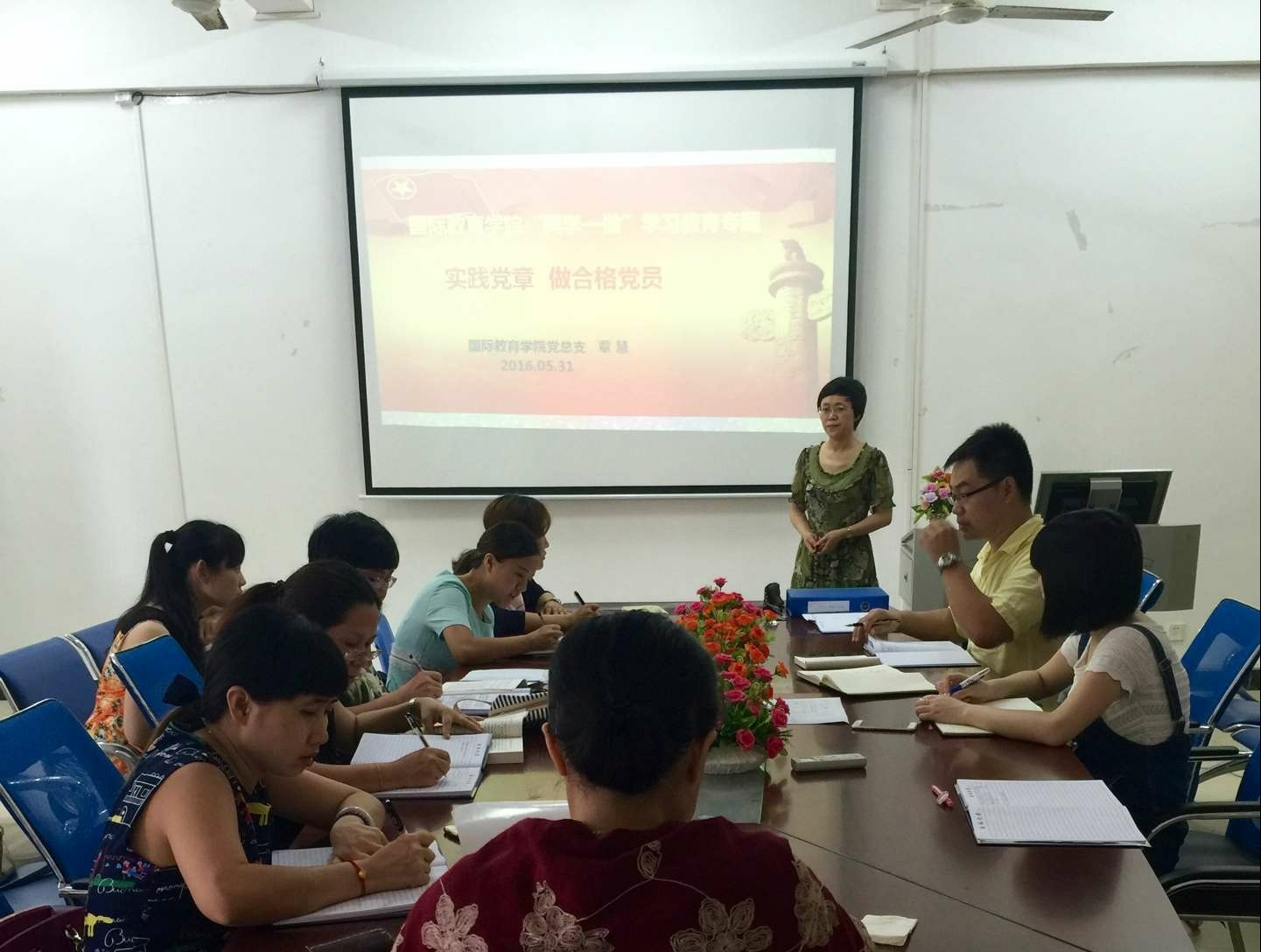 (国际教育公司 报道)5月31日下午,国际教育公司党总支以“实践党章 做合格党员”为主题,为全体党员作党课专题讲座,采取以讲促学的方式,努力在“学”这个基础上下功夫,全面深化“两学一做”学习教育。