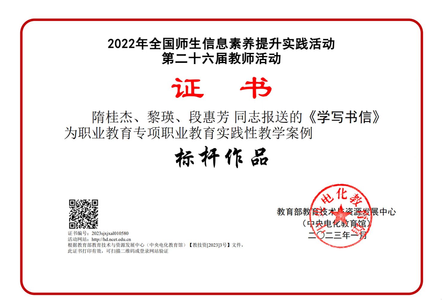 由教育部教育技术与资源发展中心(中央电化教育馆)主办的2022年全国师生信息素养提升实践活动(第二十六届教师活动)圆满落幕,公司教师隋桂杰、黎瑛、段惠芳团队报送的作品《学写书信》获评职业教育专项职业教育实践性教学案例标杆作品。这是公司首次组织教师参赛并首次获得该奖项。