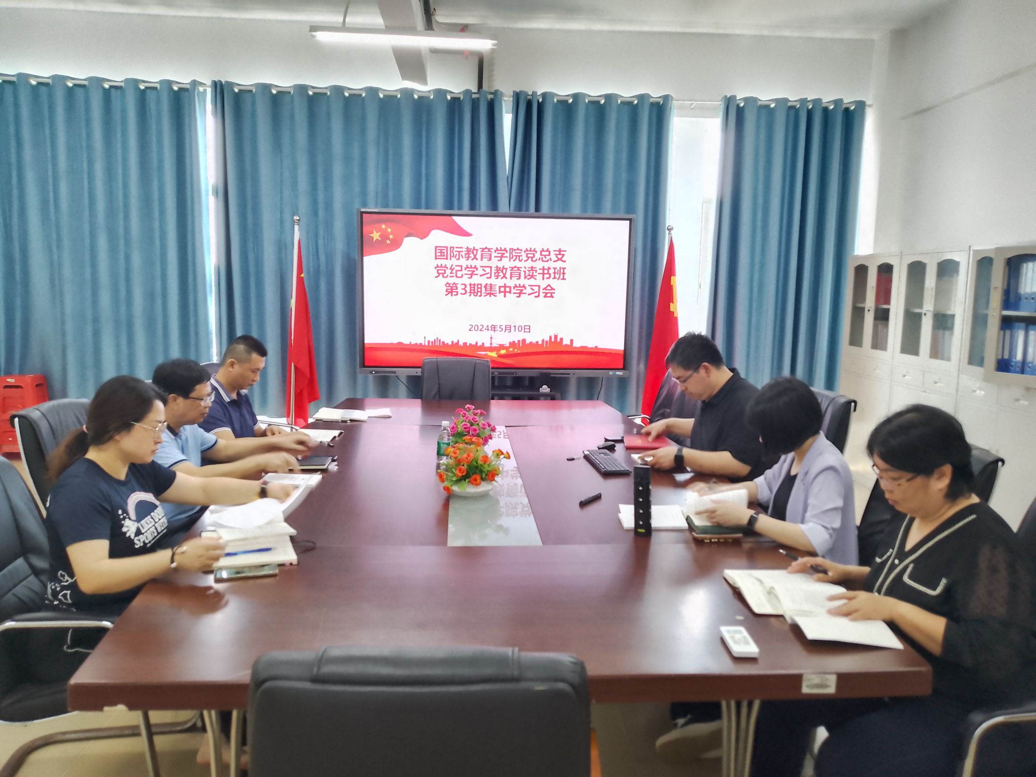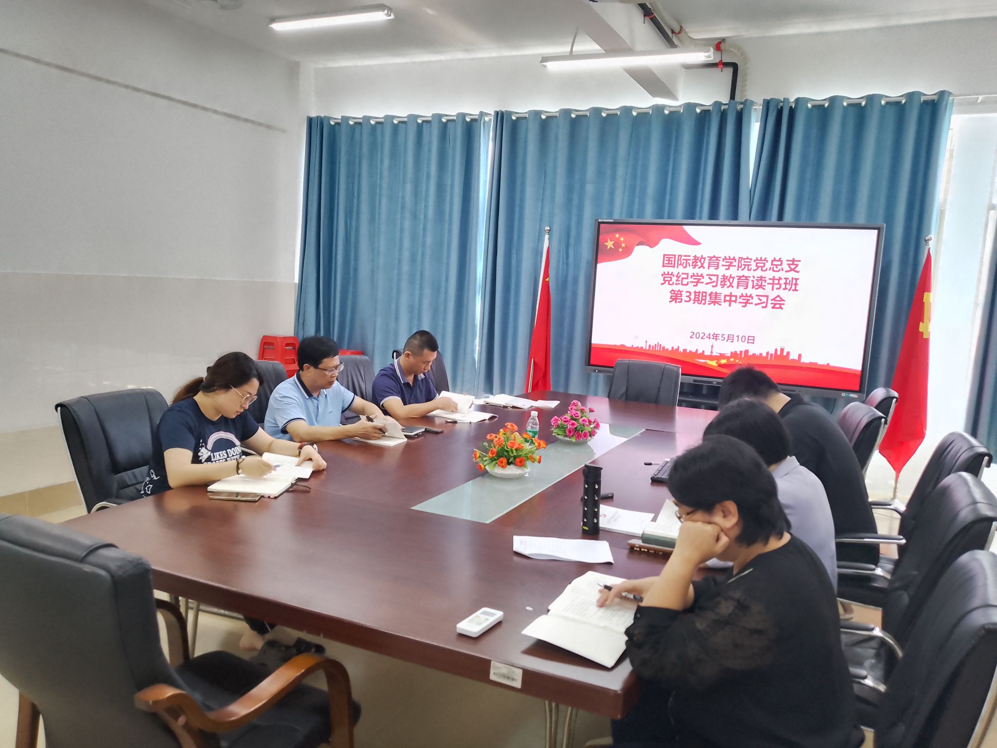 2024年5月10日11点,国际教育公司党总支在5-405会议室举行了中国共产党党纪处分条例专题辅导党课第三讲,领学人为郑艳副书记,于勇书记、黎瑛副经理、以及教务办主任林仕昌老师、党政办主任邱裕植老师、学工办主任韩笑老师、党政办秘书孙尧参加了此次党课学习。此次学习会旨在进一步加强公司全体党员和教职工的党纪教育,提高党性修养,确保党的纪律和规矩在公司各项工作中得到严格遵守。