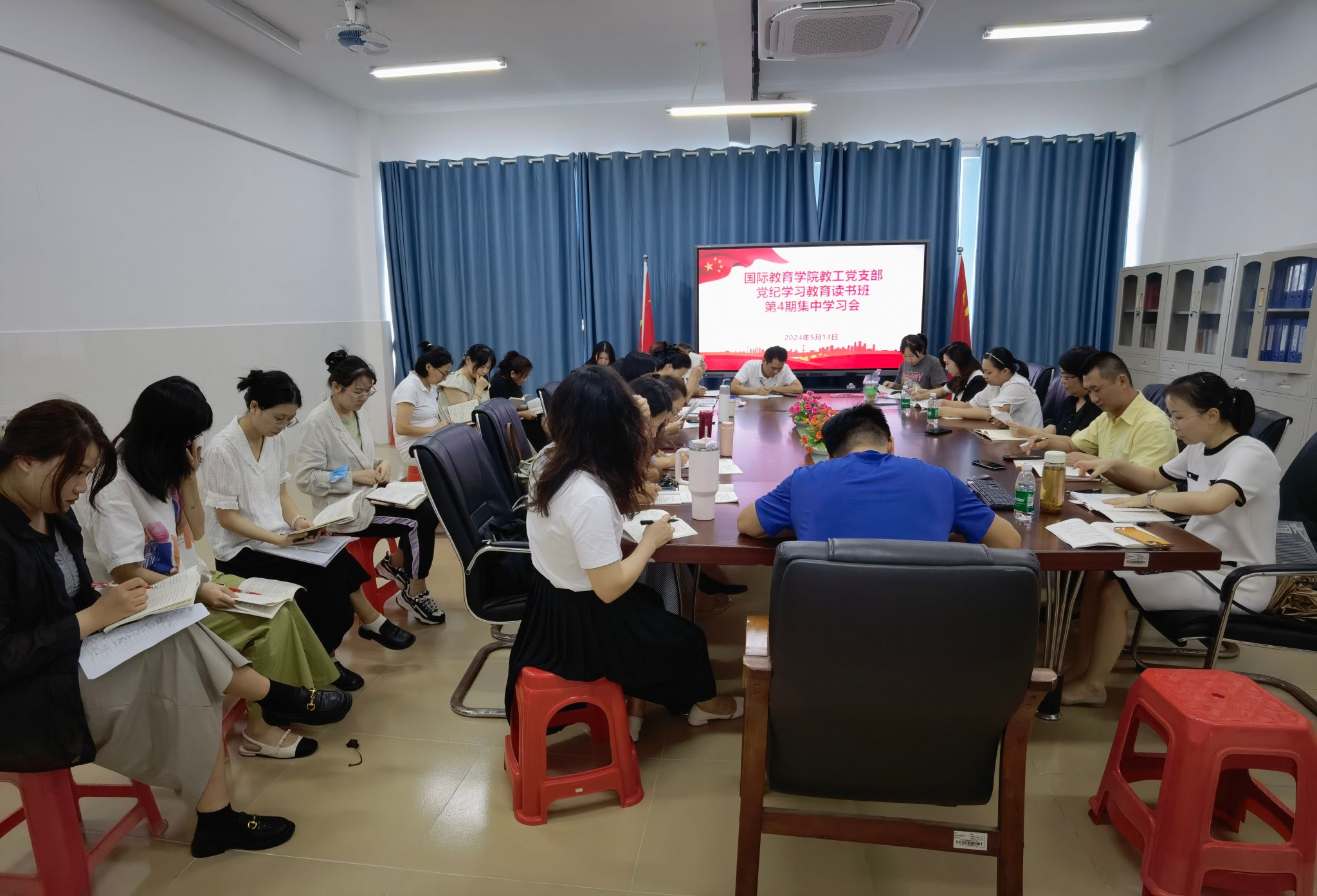 2024年5月14日下午,国际教育公司教工党支部在5-405开展了《中国共产党纪律处分条例》第四期集中学习会。支部全体党员集中学习《条例》第五章至第十 一章。