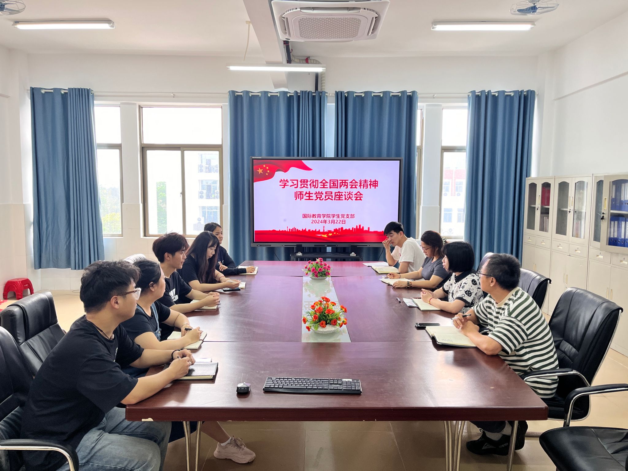 3月22日,国际教育公司员工党支部召开学习贯彻全国两会精神师生党员座谈会。支部全体党员教师和员工党员代表参加了座谈会,会议由党总支副书记、支部书记郑艳主持。