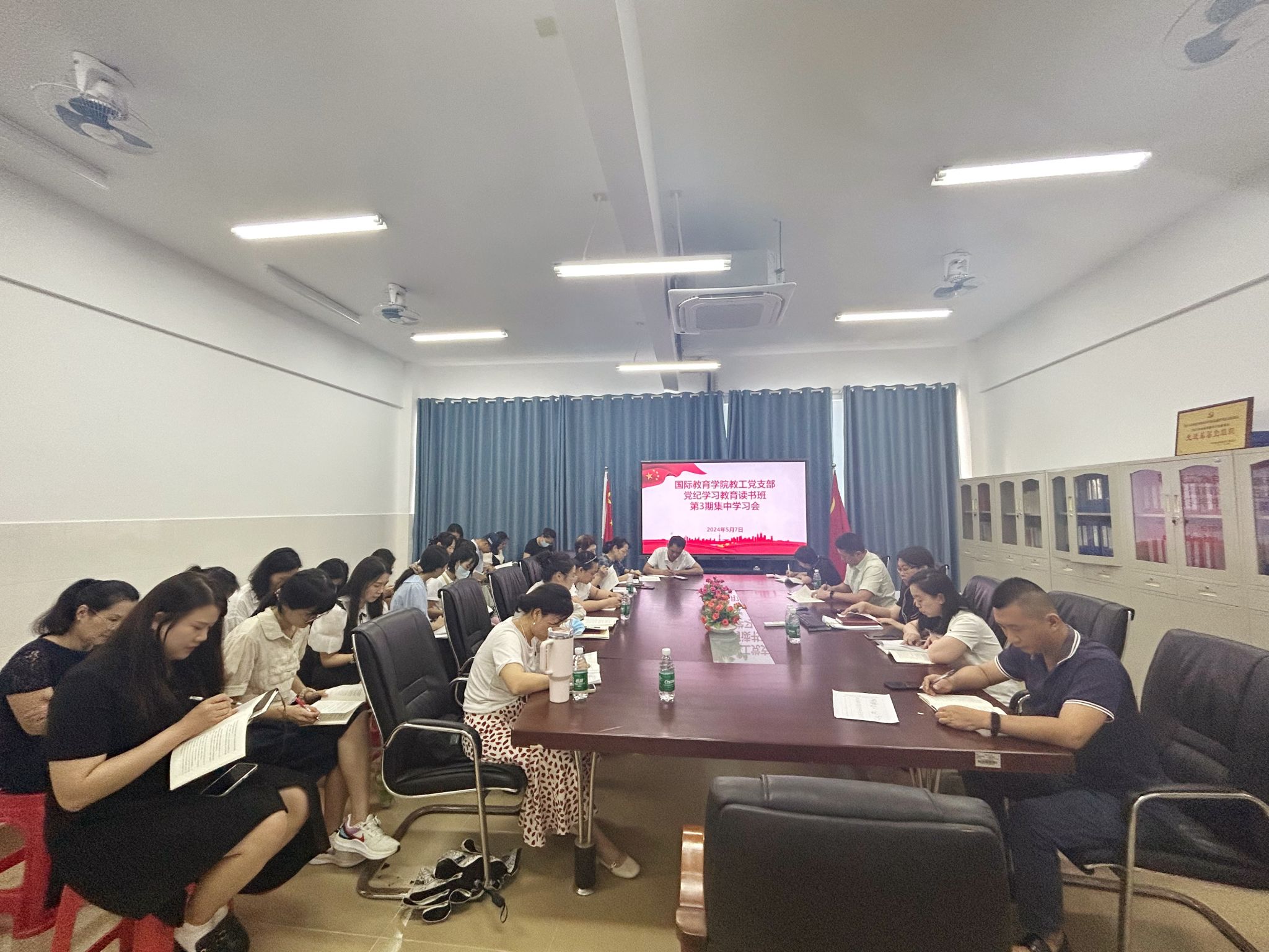 2024年5月7日下午,国际教育公司教工党支部在5-405开展了《中国共产党纪律处分条例》第三期集中学习会。本次学习会由韩大伟、李红梅、易水涵、向梅四位同志领学,全体党员集中学习《条例》第三章和第四章。