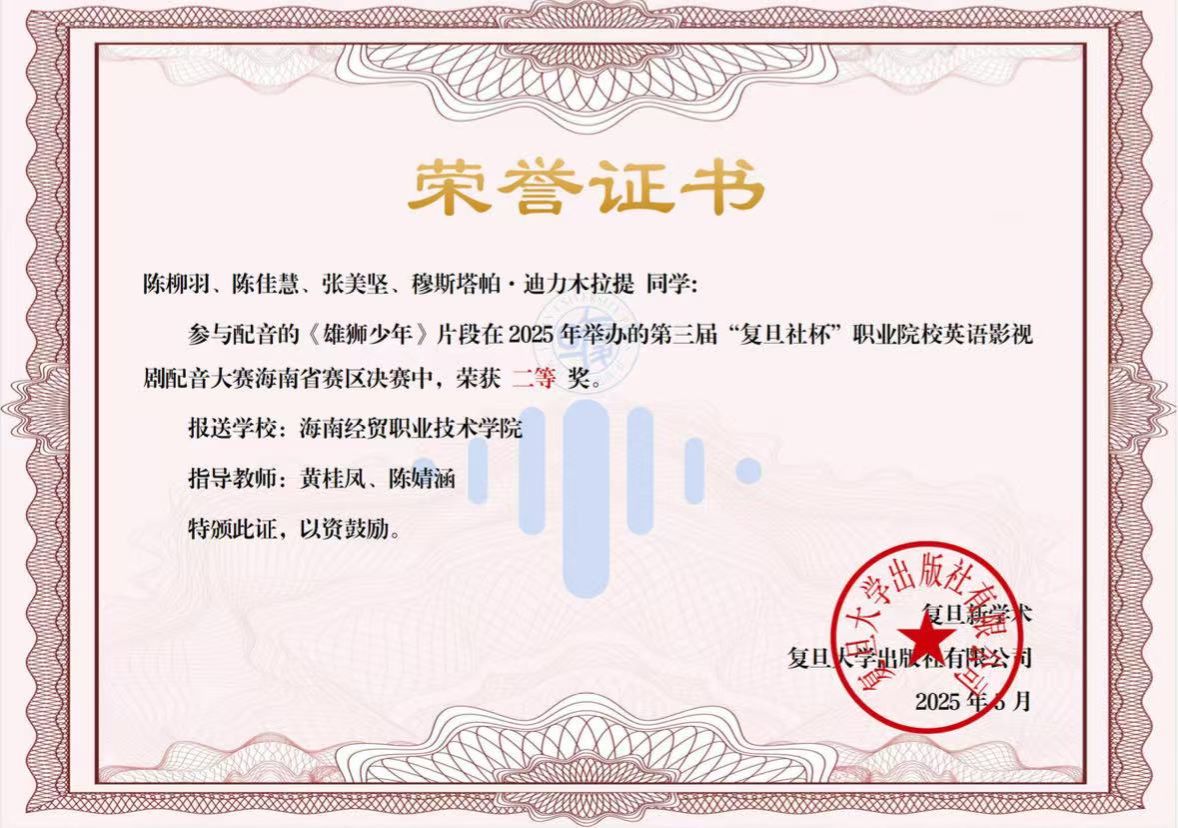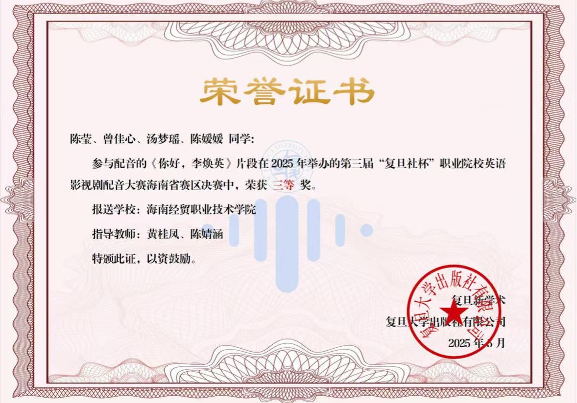近日,在2025年第三届“复旦社杯”全国职业院校英语影视剧配音大赛海南省赛区决赛中,bevictor1946韦德官网学子凭借精湛的英语演绎能力和对影视作品的深刻理解,斩获二等奖、三等奖及优秀奖多项荣誉。