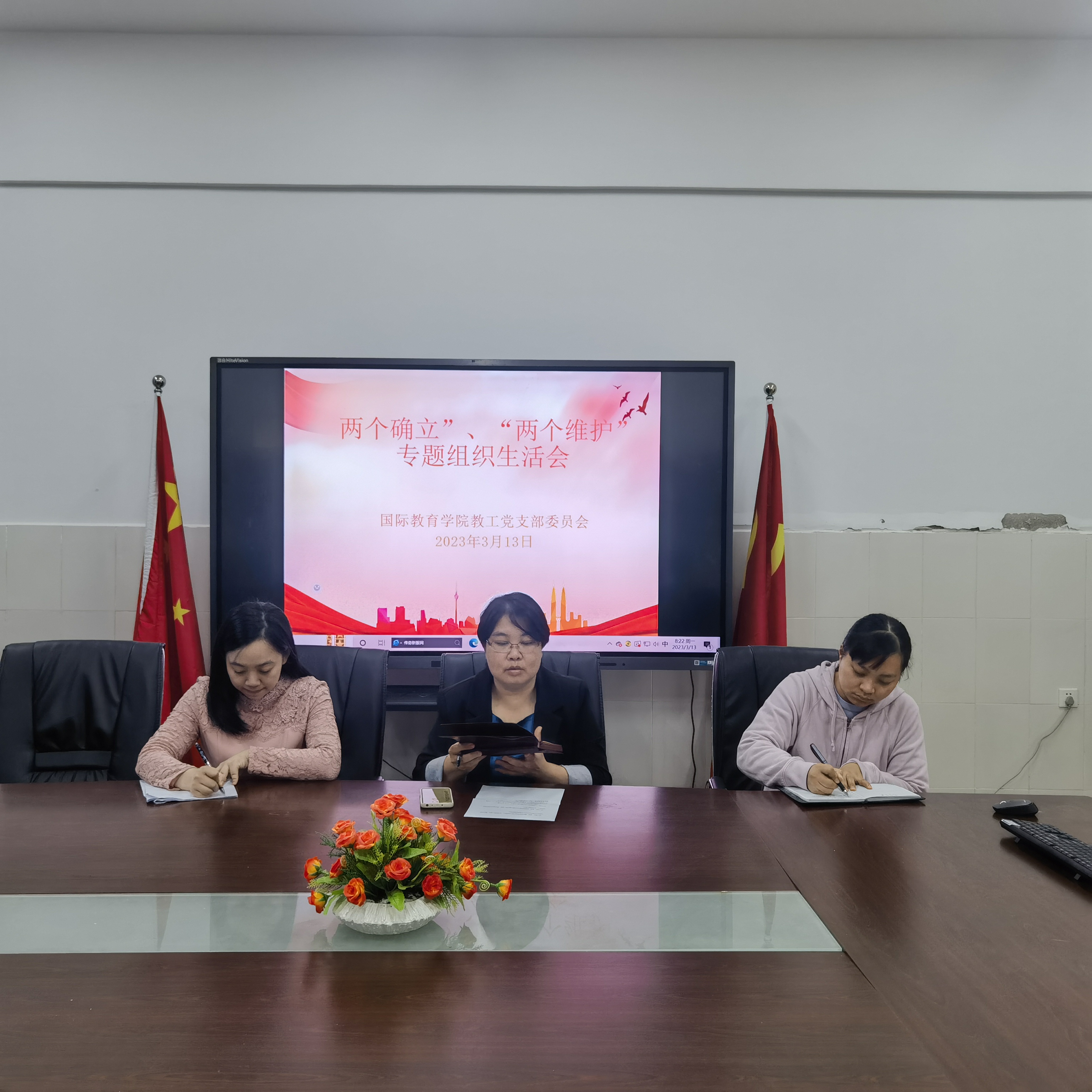 2023年3月13日,国际教育公司教工党支部委员会在5-411 举行了“两个确立”、“两个维护”专题组织生活会,会议由教工党支部书记黎瑛同志主持。