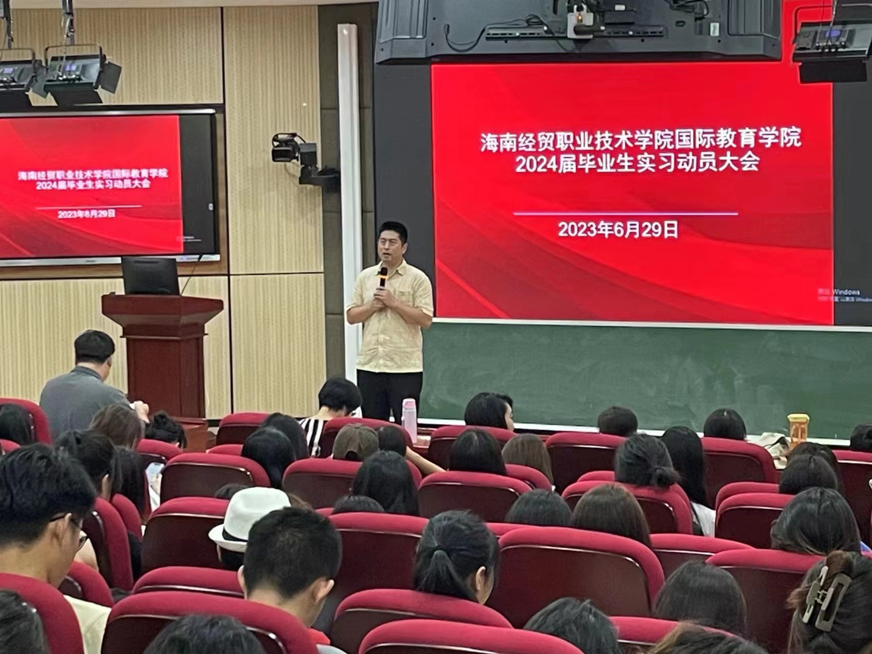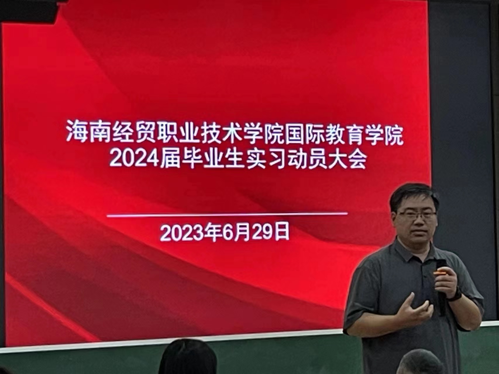 2023年6月29日,国际教育公司召开了2024届毕业生动员大会。国际教育公司领导班子、教务办、学工办、实习指导老师等参加动员大会,会议由黎瑛副经理主持。会上,韩大伟经理、于勇书记分别做了动员讲话,勉励同学们树立志向,践行梦想;积极参与实习实践,努力提升专业技能,为母校争光。