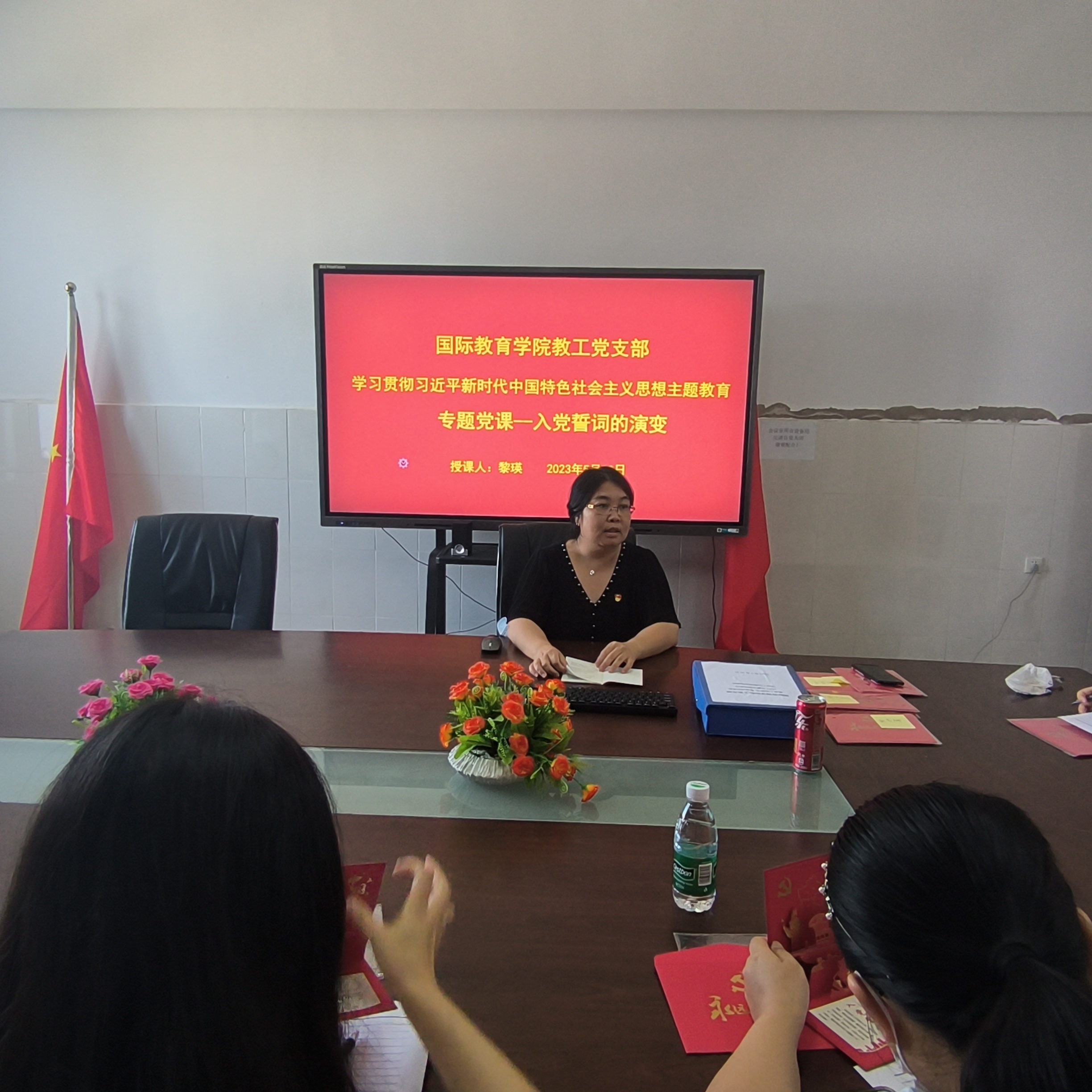 2023年5月30日下午,国际教育公司教工党支部在党员学习会议室5-405开展党课学习,由支部书记黎瑛同志为教工支部党员讲党课。党课以“中国共产党入党誓词的演变”为主题,从建党初期到党的十二大,梳理了入党誓词的变化沿革,重温和深刻领会誓词内涵,全体党员更加坚定永远跟党走的信念。