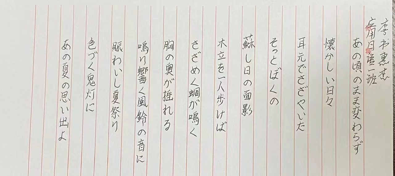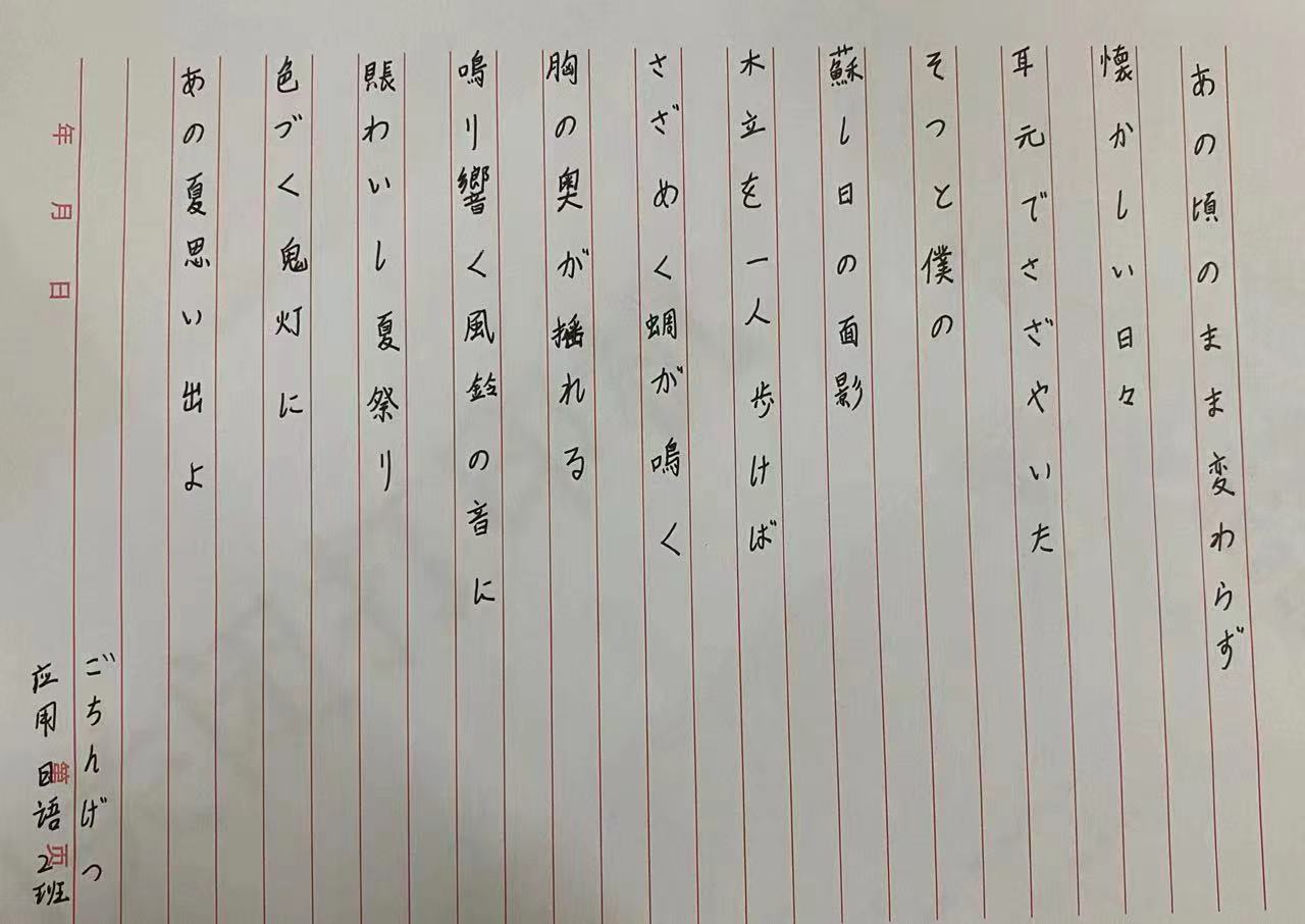 日本文字,是汉字和假名的混合体,它是由假名(包括平假名和片假名)、汉字和罗马字构成。本次日语书法大赛只出现了平假名和汉字,同学们书写的是一篇关于夏日回忆的诗歌。