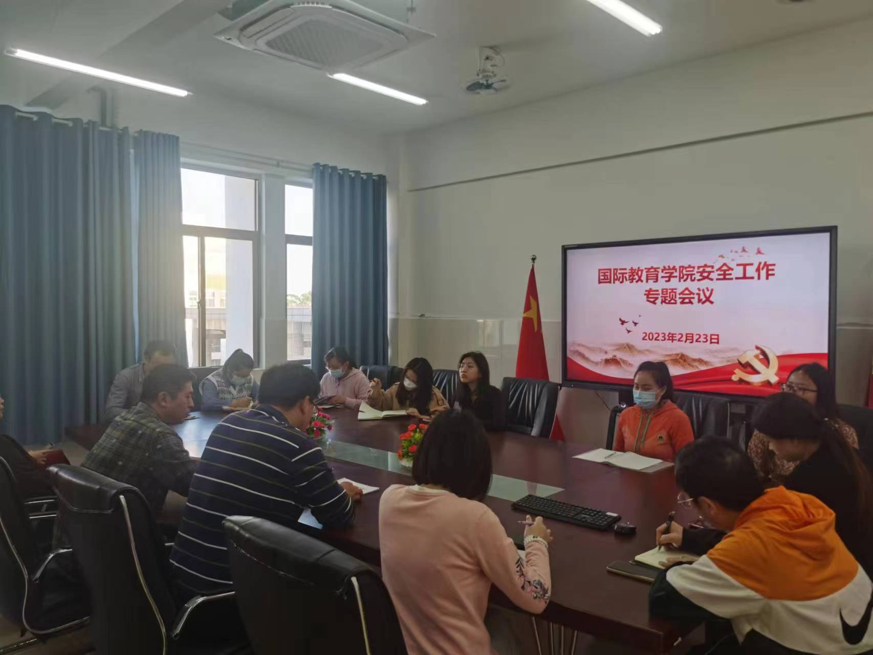 2月23日下午,国际教育公司召开2022-2023学年第二学期安全工作专题会议。国际教育公司党总支书记于勇,副经理韩大伟,副经理黎瑛、刘莉,党总支副书记郑艳出席会议。