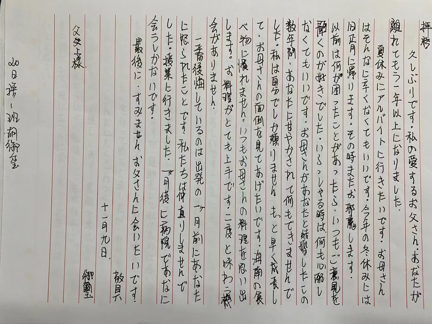 为了营造良好的日语学习氛围,进一步提高员工的日语应用能力,使员工获得良好的日语写作体验,2021年11月,举办了bevictor1946韦德官网首届日语写作大赛。本次日语写作大赛的作文标题是:《......への手紙》(给家人或朋友的一封信)。字数为200—300字。本次写作要求必须用日文标准的书信格式书写。内容必须要言之有物,有真情实感。