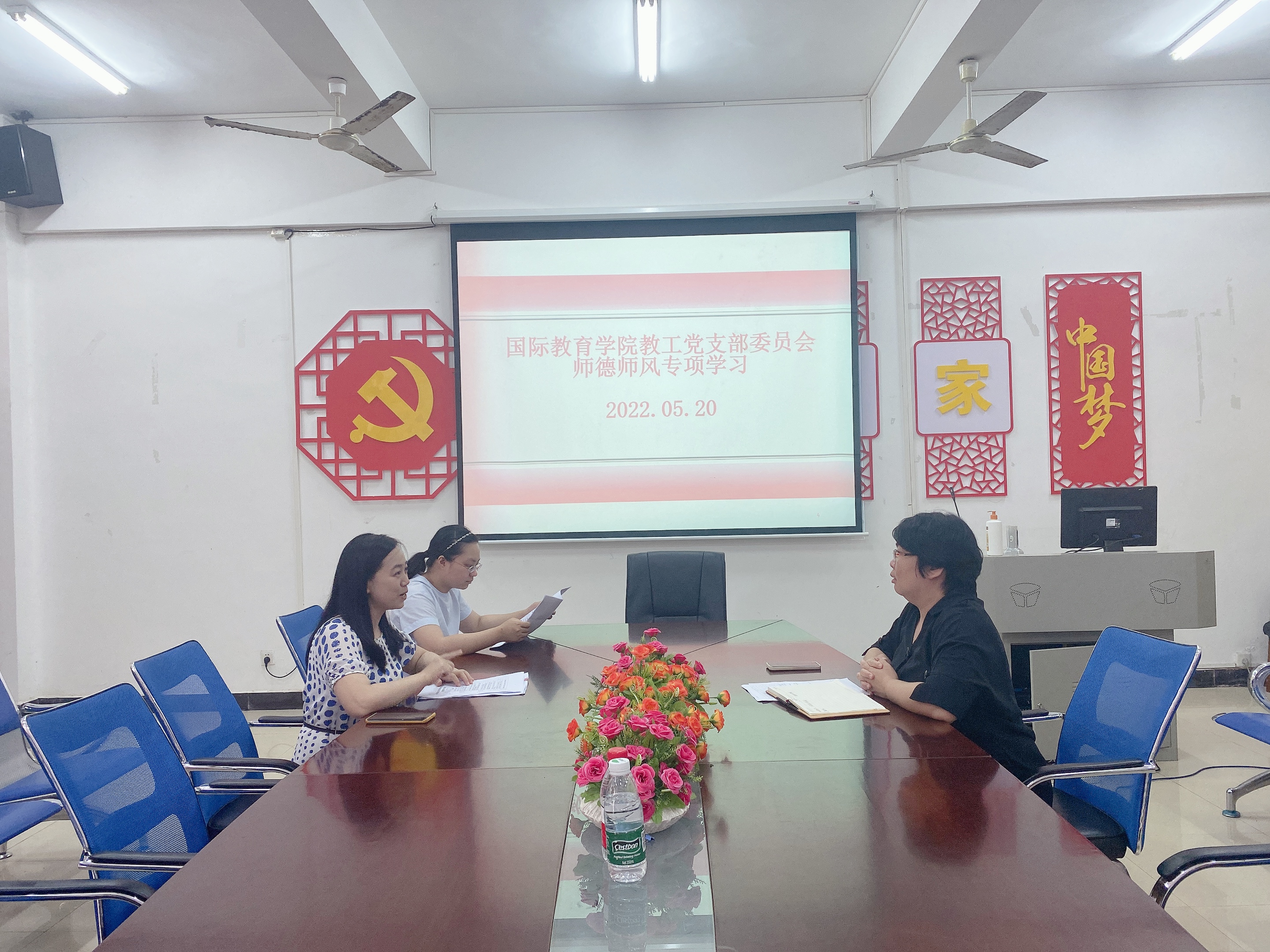 为贯彻落实习近平总书记关于师德师风的重要论述,国际教育公司教工党支部委员会于2022年5月20日下午在1-323召开了师德师风专项学习会议。会议由教工党支部书记黎瑛主持,支部委员符雪妮和李红梅参加了会议。