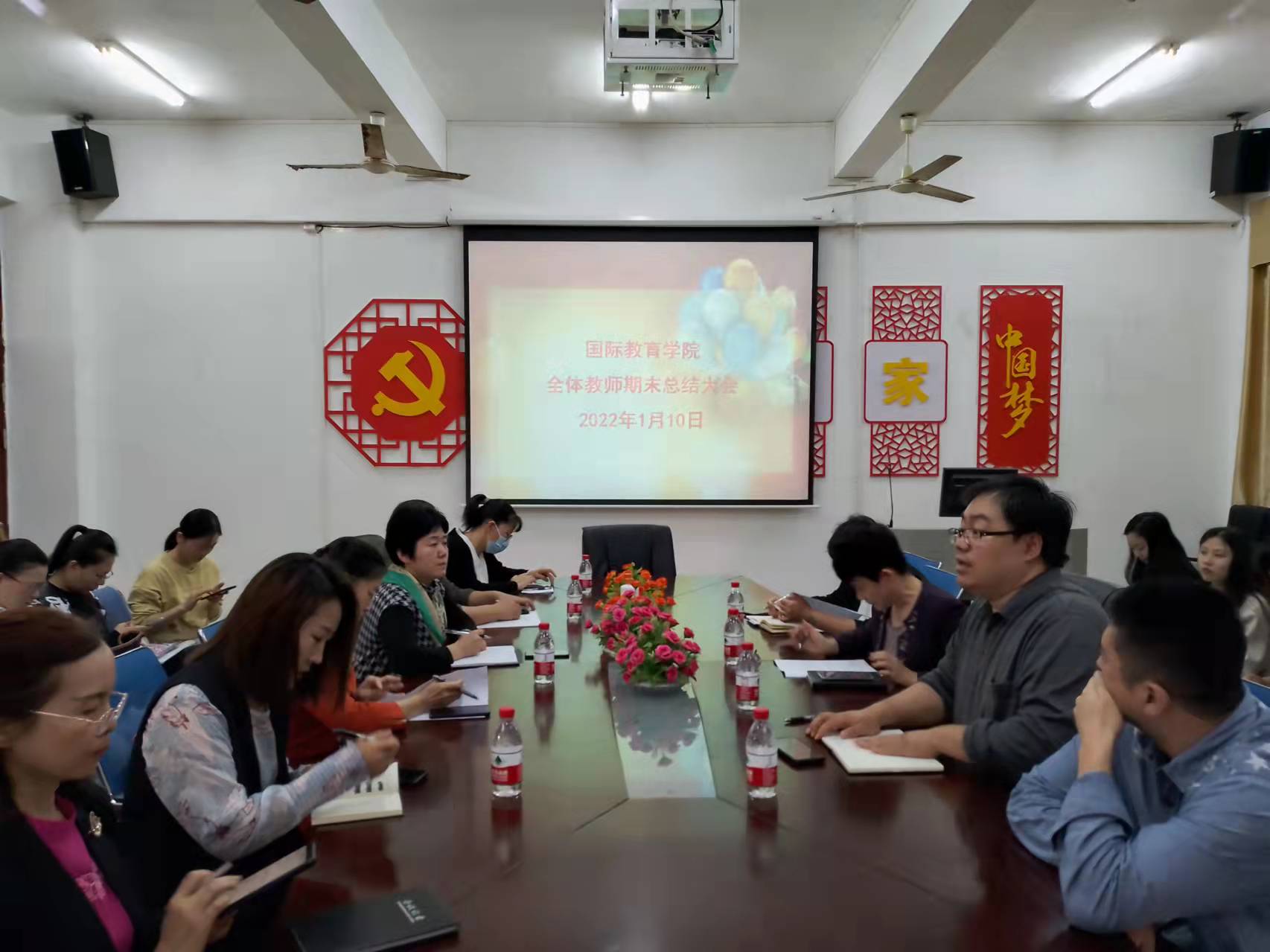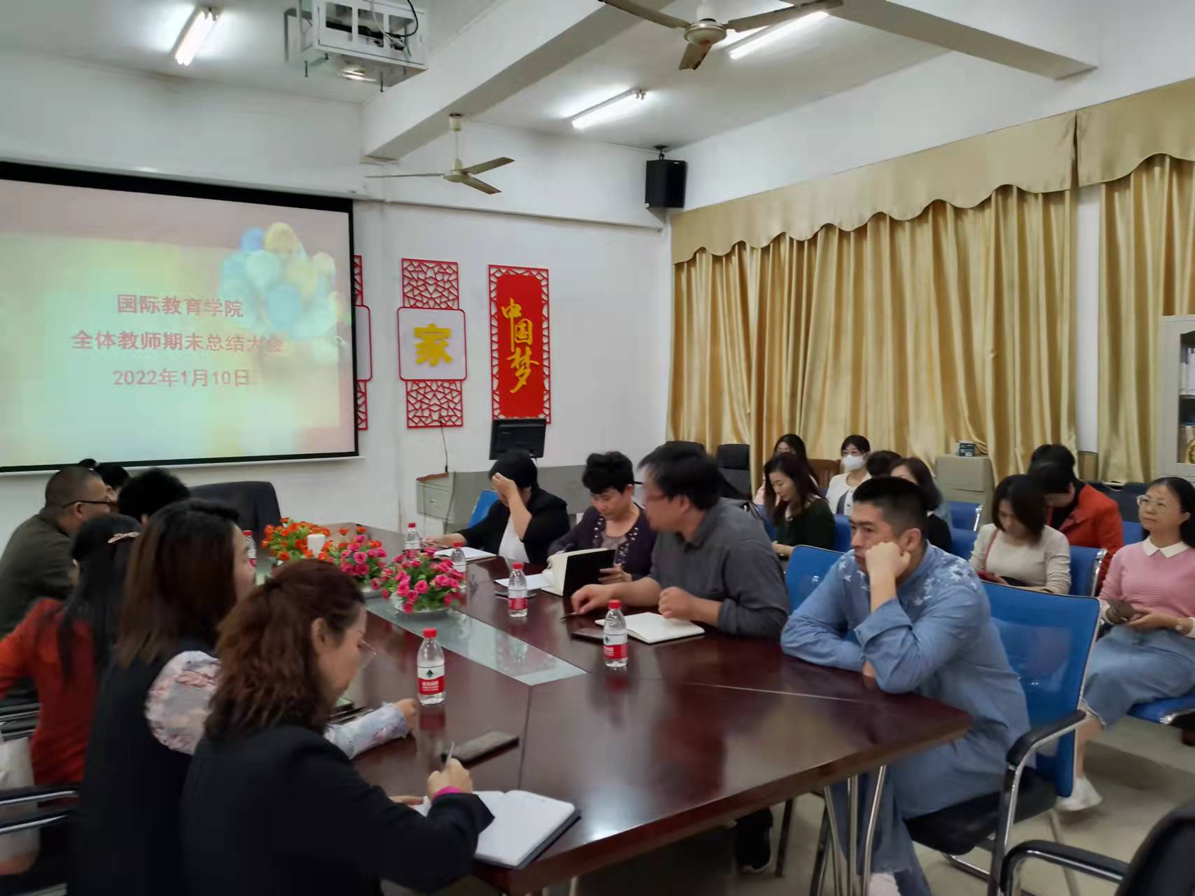 2022年1月10日,国际教育公司在1-323会议室召开全体教师期末总结大会,国际教育公司党总支书记于勇、经理张春玲、副经理黎瑛、副经理韩大伟以及全体教师参加了本次会议。