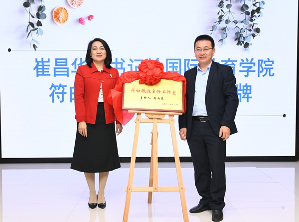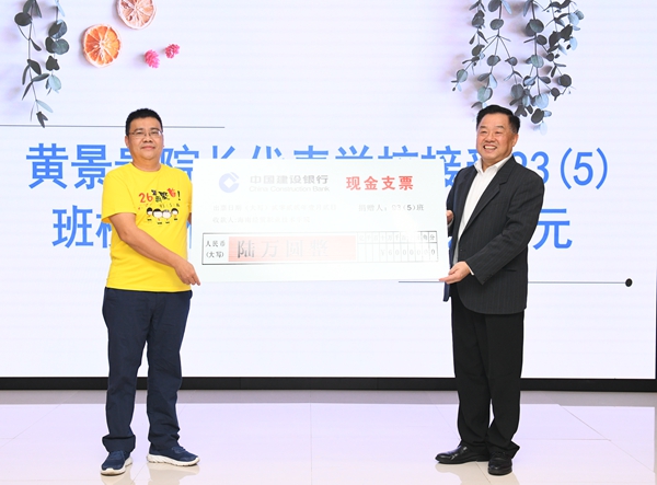 在热烈的掌声中,黄景贵代表公司,接受93(5)班6万元的捐赠支票。崔昌华为符白薇班主任工作室授牌。