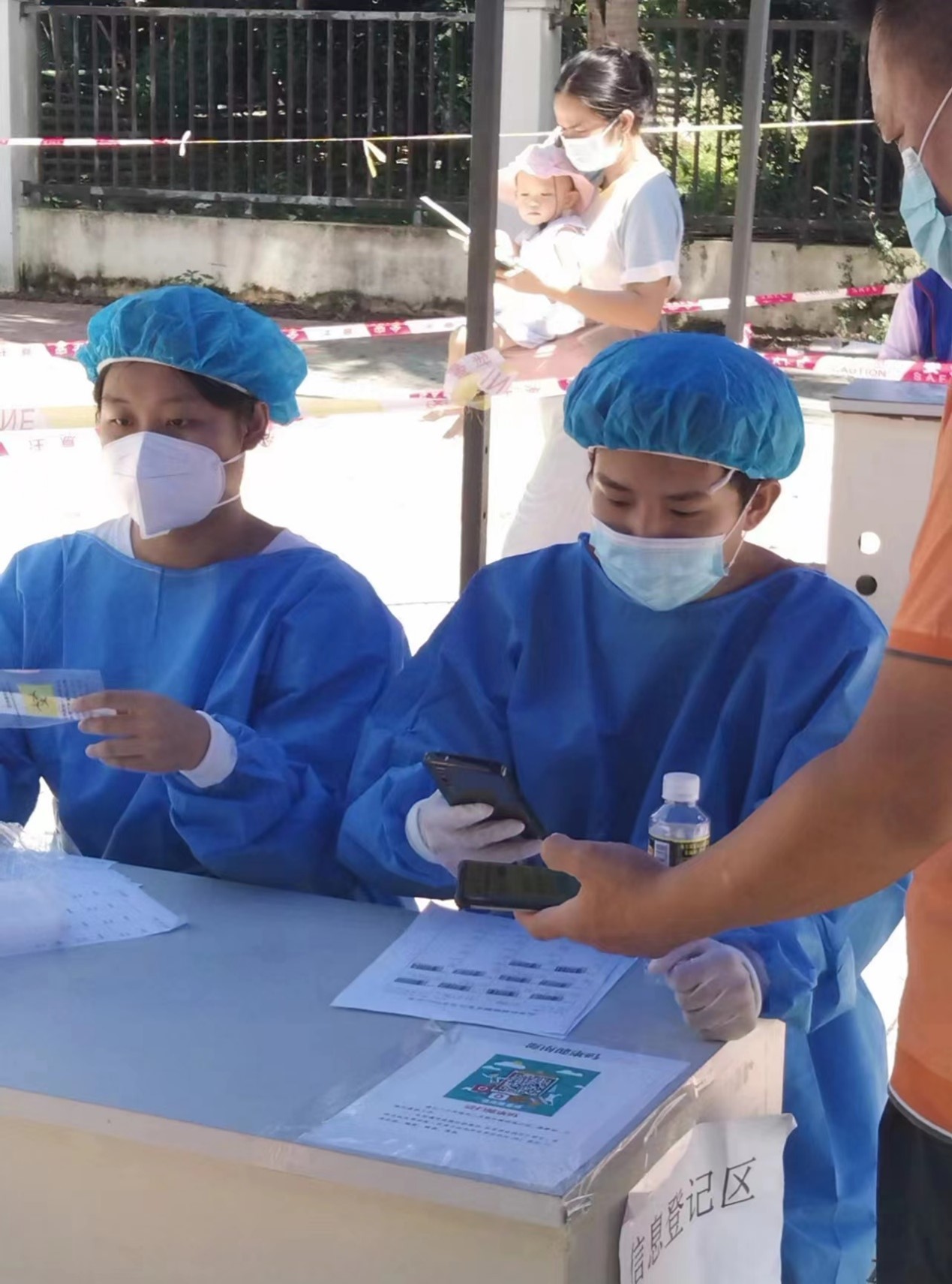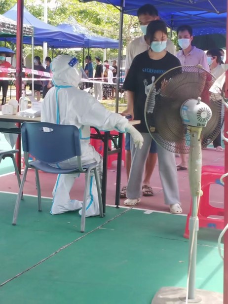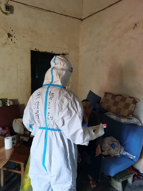 杨国聪目前每天在距儋州市区11公里处的兰洋镇,从事防疫志愿服务。每天的工作任务就是在做好个人防护的同时,听从指挥,协助社区和医护人员,维持现场秩序,采集信息等工作。每天一大早五点多就起床,投入到一天的工作中。由于每天,各个核酸检测点的工作安排不一样,经常是镇上哪个核酸检测现场需要人手,就去哪个检测点服务。每天的工作时间经常从六、七个小时,到十个小时不等。每天的工作任务非常忙碌,经常是一回到家,本来是只打算躺下休息一会儿,却能睡到第二天五点半闹钟响起,洗把脸,再去镇上开始新的一天的工作。杨国聪同学曾经两天,和医护人员一起下村,去乡下为躺在床上无法行走的人、腿骨折的人、孕妇及婴幼儿等弱势群体开展敲门行动,对他们进行上门检测,录入信息。那几天的经历对刚刚步入老员工活的杨同学来说,非常难忘。儋州的天气又闷又热,政府派车把穿着防护服的他们拉到村口,然后他们自己步行去挨家挨户的敲门,问候,进行信息采集,做核酸。虽然又苦又累,穿着防护服,不能喝水,呼吸困难,有一次感觉差点中暑晕倒,但是当他结束一天的志愿者工作,觉得能为行动不便的人,尽到自己的一份力量感到非常自豪。“当我为行动不便的人做完采集服务,看到躺在床上的他,对我投来的感激的眼神,以及听到他们家人对我说的感谢的话,我感到非常的满足。”杨国聪非常的骄傲。