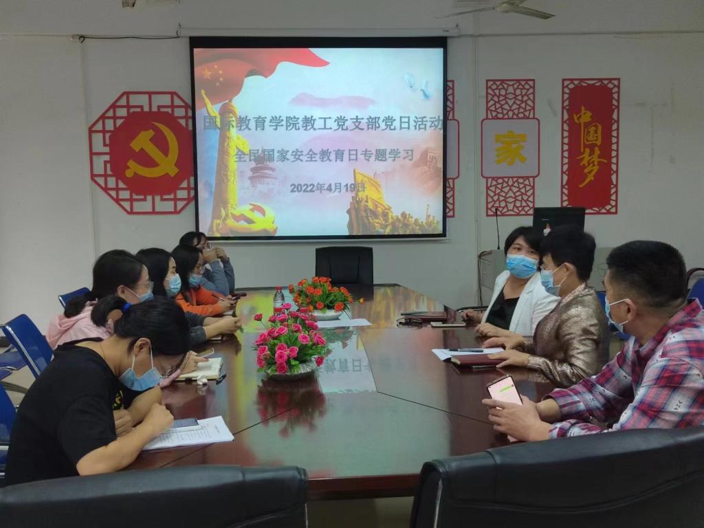 2022年4月19日下午,国际教育公司教工党支部在1-323会议室开展全民国家安全教育日专题学习党日活动,教工党支部党员参加了本次活动,会议由支部书记黎瑛同志主持。