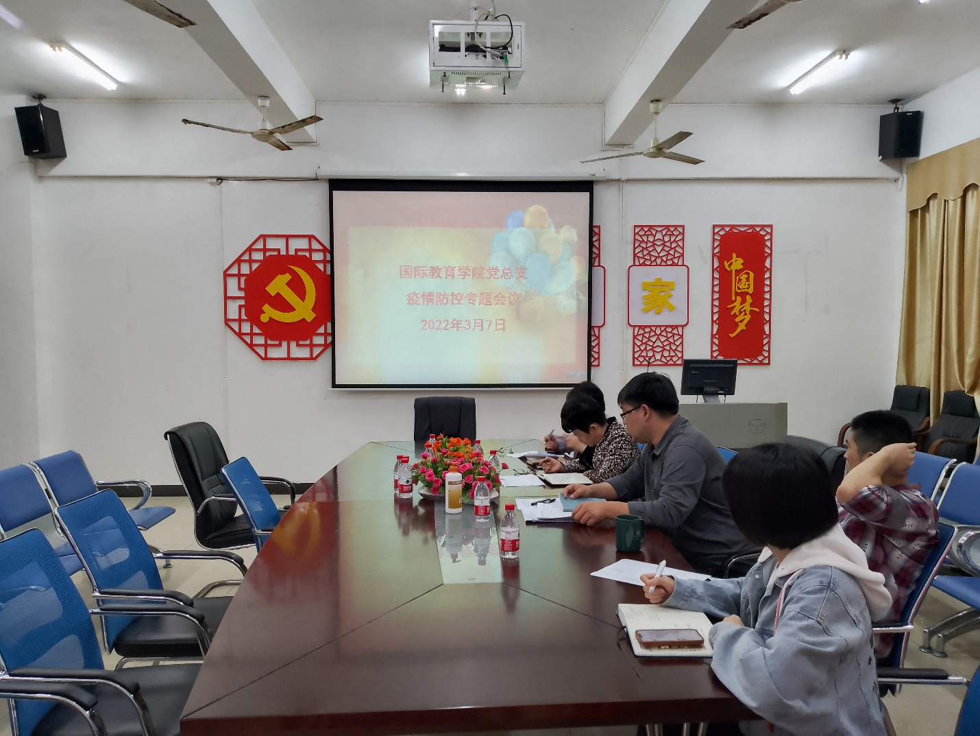 2022年3月7日,国际教育公司党总支在1-323会议室召开了疫情防控专题会议,国际教育公司党总支书记于勇、张春玲经理、黎瑛副经理、韩大伟副经理、郑艳副书记参加了此次会议。于勇书记对当前国内国外疫情防控面临的严峻形势做出了总结。同时,他针对对海南省的疫情防控形势对公司师生疫情防控措施提出了几点意见,一是要加强日常消毒工作,二是要在课堂教学和日常办公中佩戴口,三是做好迎接国际员工回校学习的预案。