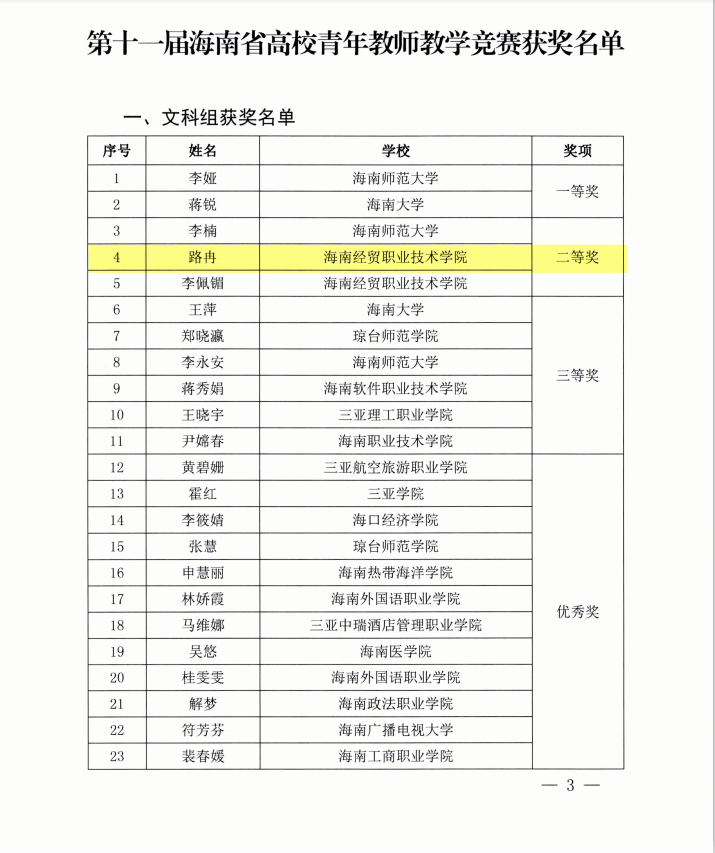 由海南省教育厅、海南省教育工会主办的第十一届海南省高校青年教师教学竞赛近日在海口圆满举行。公司韩语专任教师路冉与来自全省21所高校的45名选手在省级决赛中同台竞技,喜获二等奖,为海南省高职院校第一名。