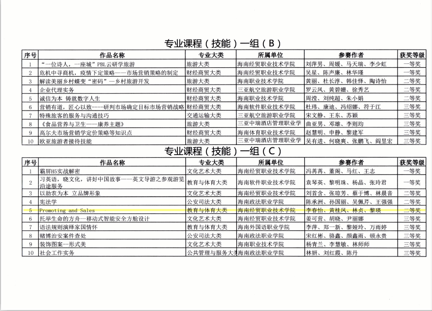 为积极提高自身教学技能和信息技术素养,推动信息技术与公司产品深度融合,2020年8月29日,公司李春怡、黄桂凤、林贞、黎瑛等四位教师积极参与海南省2020年高等职业院校技能大赛教学能力比赛,并以参赛作品《Promoting and Sales》荣获专业课程(技能)一组二等奖,为校争光!