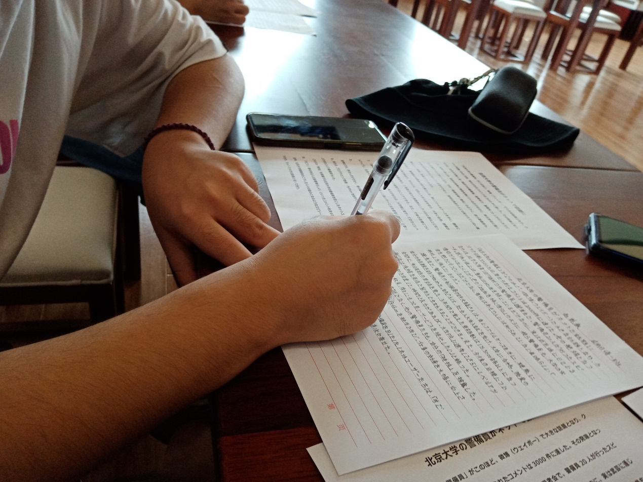 为了让大家深入了解日语,培养学习日语的兴趣,增强对日语文字的认识,近日,国际教育公司举办了“bevictor1946韦德官网第二届日语书法比赛“。本次比赛的具体形式为比赛选手对日语短文《北京大学の警備員がネットで話題に》进行抄写,抄完后上交致评委老师处等待评选。应邀出席本次比赛的评委有王耀义老师,黄金玉老师及外教HAYASHI YOSHIE老师。