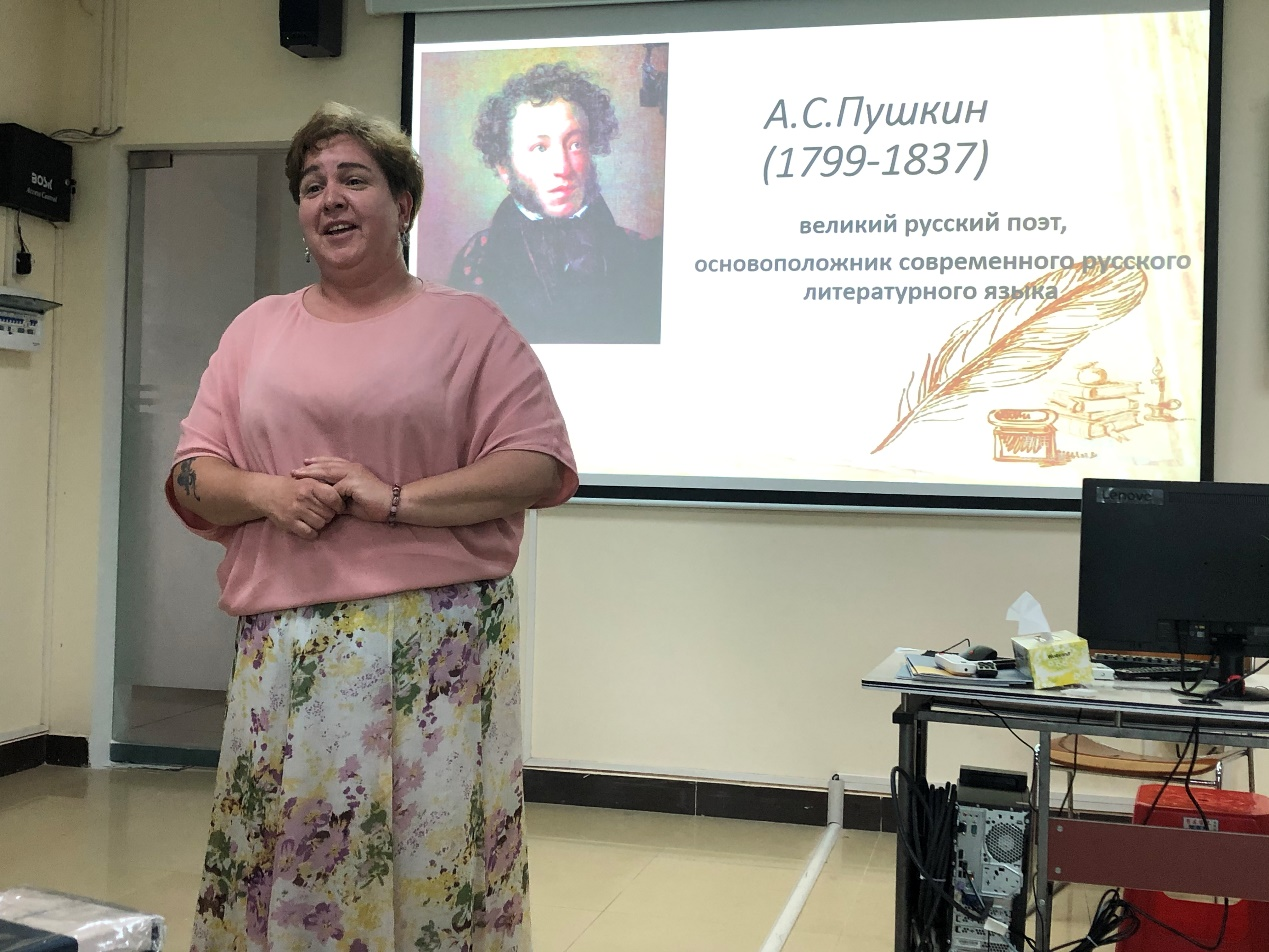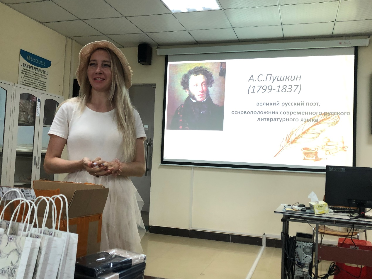 本次比赛选取的是俄罗斯伟大诗人,现代俄语奠基人普希金的诗歌。外籍教师阿纳斯塔西娅向员工们详细介绍了诗人普希金及其在俄罗斯的重要地位,俄语教师黄梓瑶进行翻译。