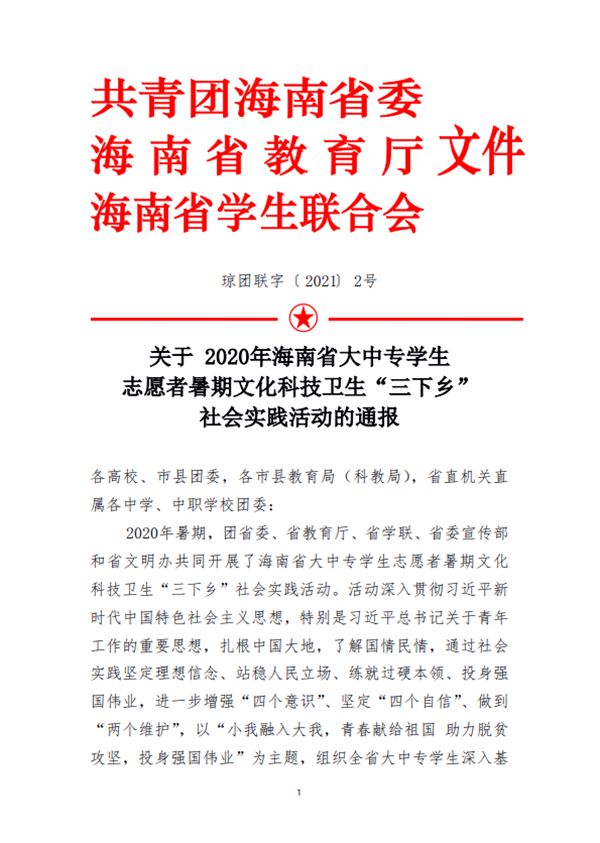 近日,共青团海南省委、海南省教育厅及海南省学联下发的《关于2020年海南省大中专员工志愿者暑期文化科技卫生“三下乡” 社会实践活动的通报》中,国际教育公司“大爱无疆 重见阳光”社会实践队荣获“优秀团队”称号;