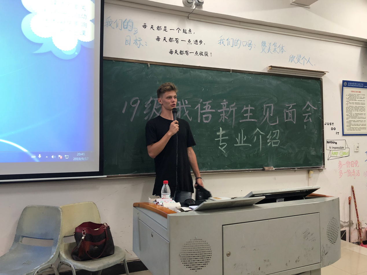 19级新生代表发言,表明自己的志向以及对俄语的期待,分享自己学习俄语的方法与心得