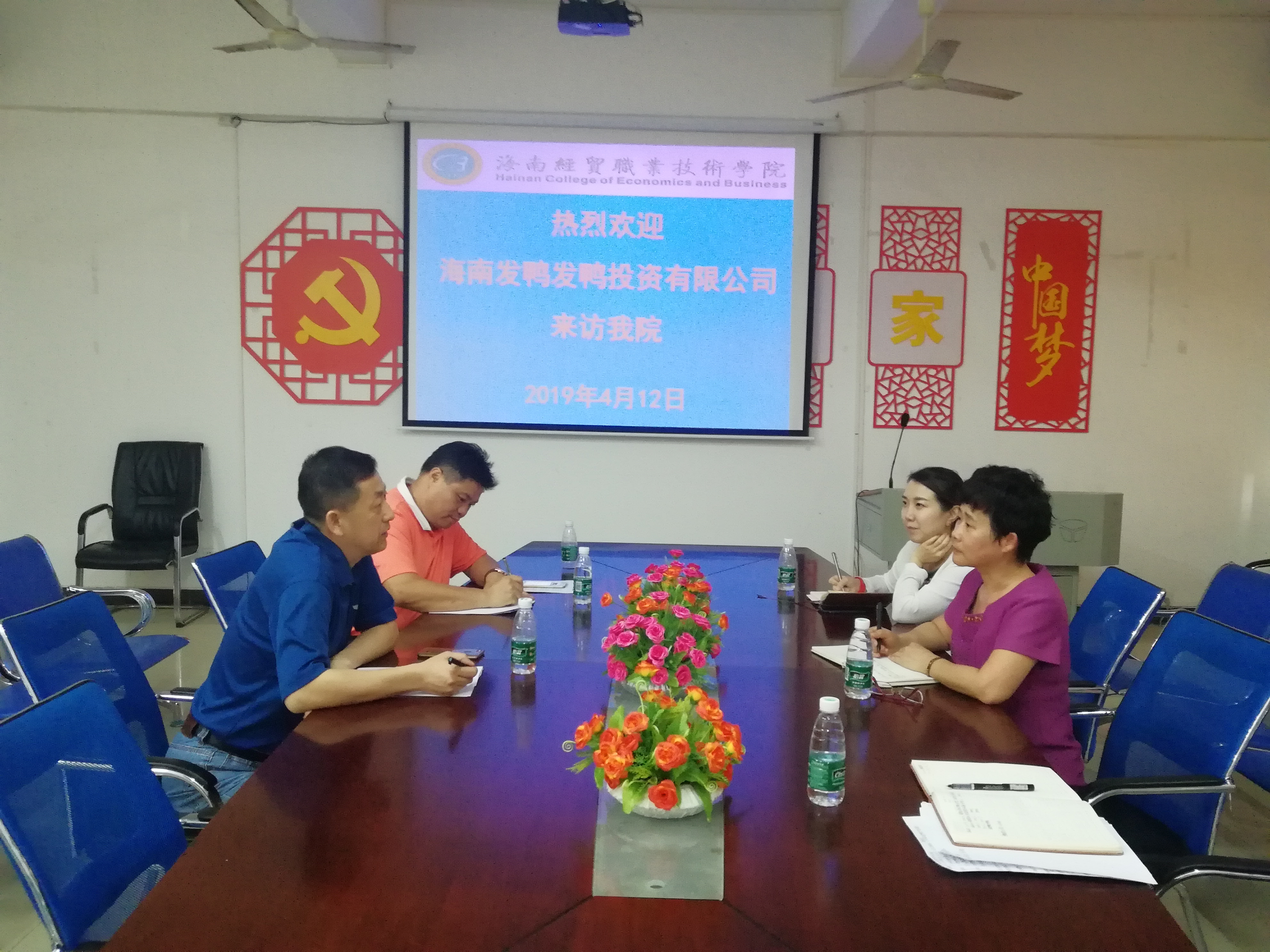 2019年4月13日, 为促进公司与尼泊尔的教育合作交流,泰中普吉商会创始人、海南发鸭发鸭投资有限公司董事长南建陆和世界石材产业联盟有限公司创始人、海南发鸭发鸭投资有限公司执行董事邵明涛先生来访公司,就公司与尼泊尔相关院校教育合作事宜进行洽谈。国际教育公司经理张春玲、尼泊尔项目负责人向梅老师、院办孙尧老师参与了交流会。