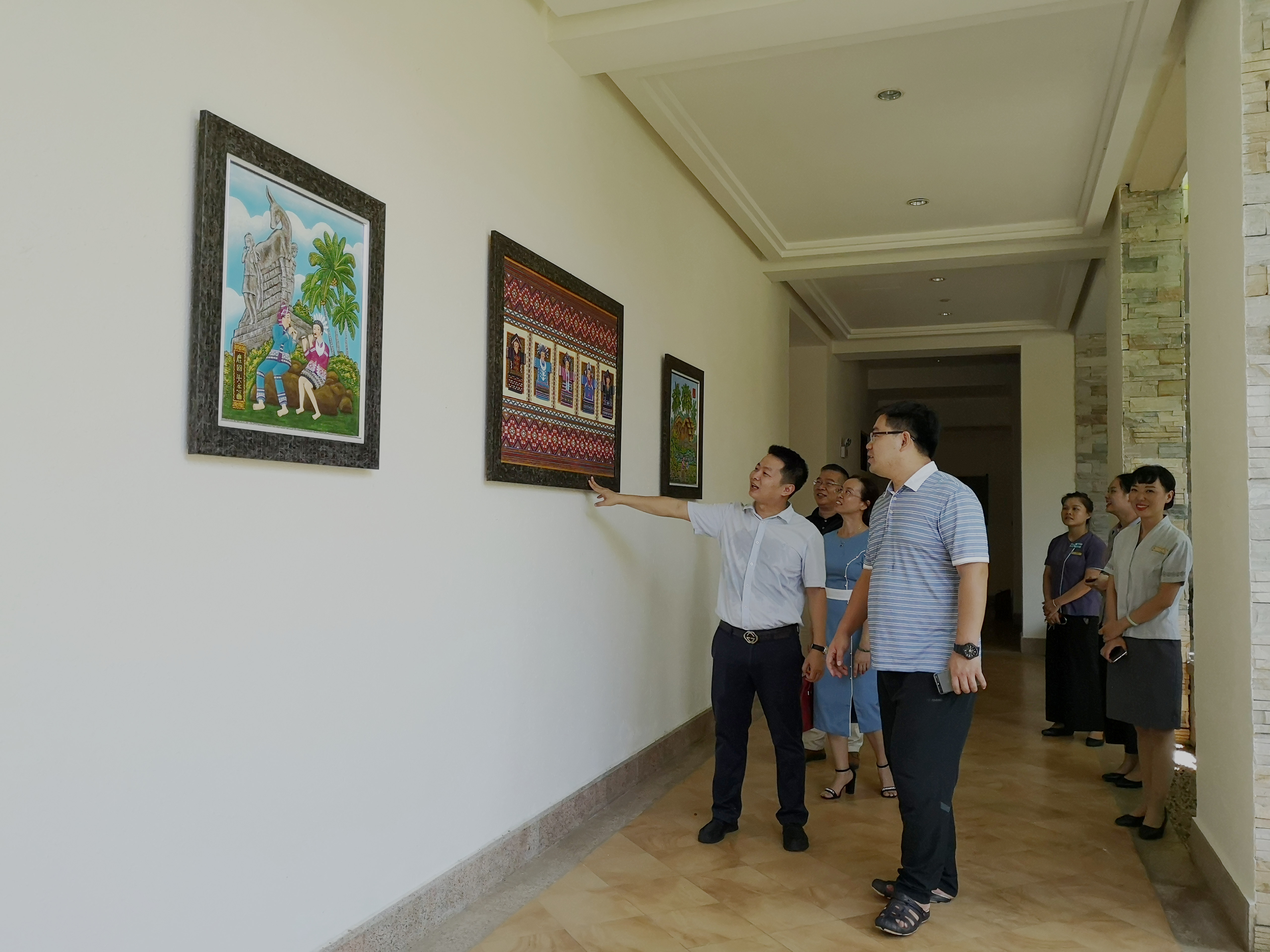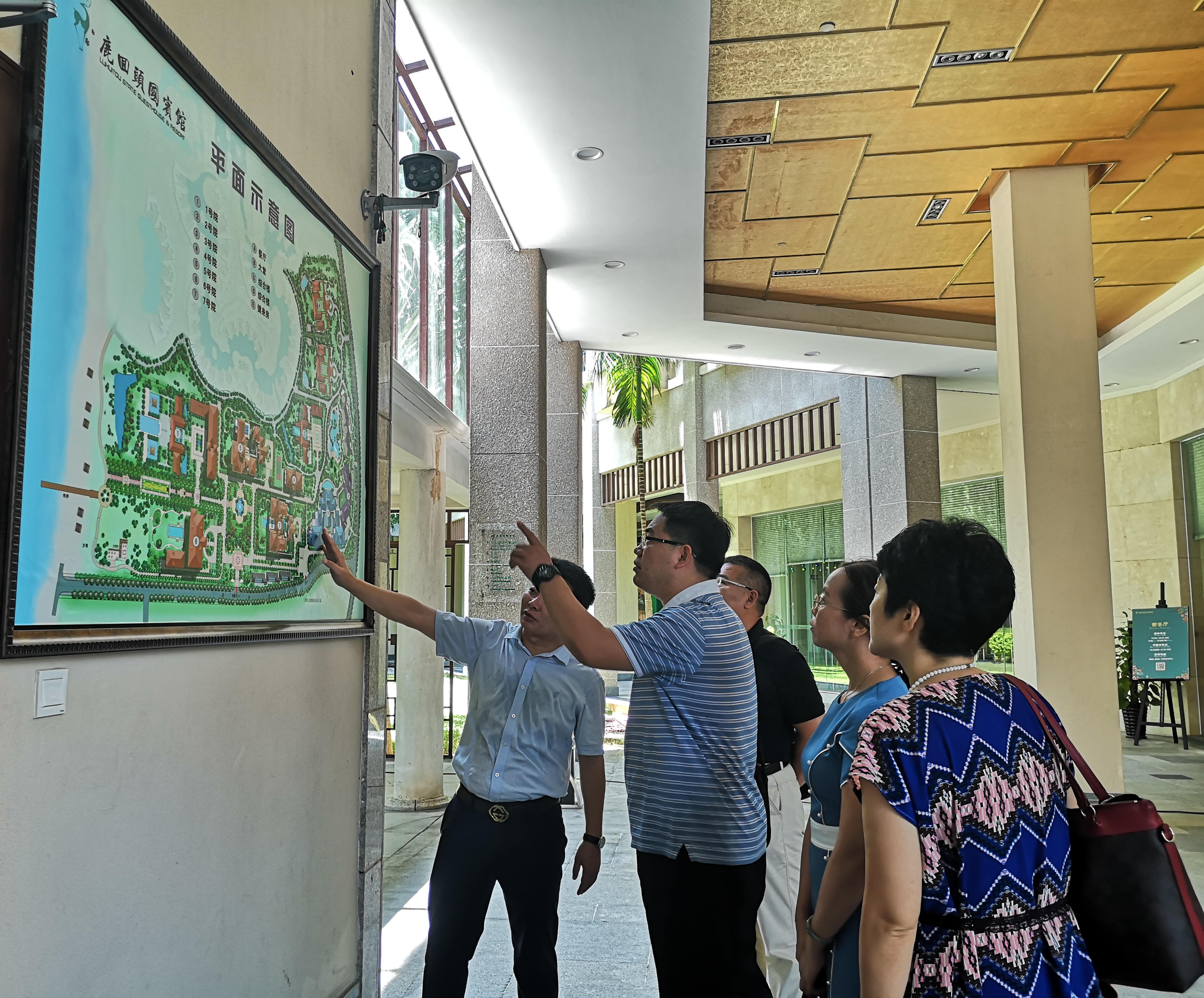 在三亚鹿回头国宾馆,龙田平主任带领公司领导及各位专业主任参观鹿回头国宾馆,并向于勇老师详细介绍国宾馆内部的区域划分、历史沿革等,于勇老师详细询问、了解有关三亚鹿回头国宾馆对相关人才需求的条件。